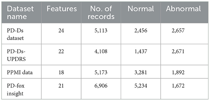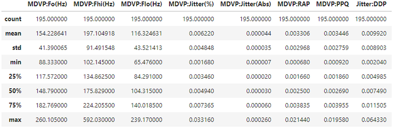 The PD dataset was obtained from the Kaggle repository. It includes features such as average, maximum, and minimum vocal fundamental frequency, pitch perturbation quotient, noise-to-harmonics ratio, harmonics-to-noise ratio, and status. Dopamine deficiency is one of the hallmarks of PD, which is a neurodegenerative disease that affects the brain. This manifested as reduced motor skills, such as tremors and rigidity.