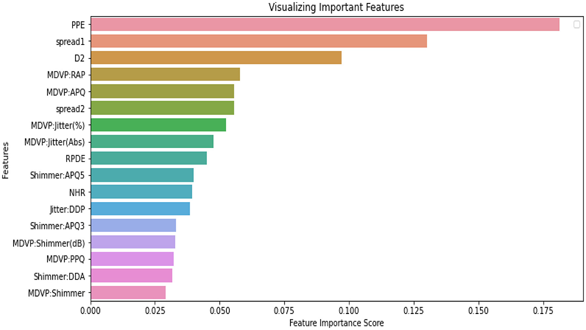 Figure 5 presents the features with important scores for PD detection using the LDEFS technique. The most relevant features are Pitch Period Entropy (PPE), spread1, D2, and MVDP RAP.