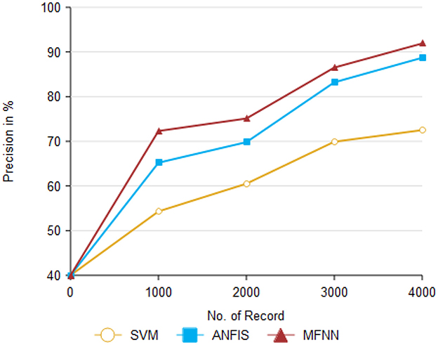 Figure 9 and Table 3 present the precision performance of the proposed MFNN method compared to previous ML classifiers. Precision is a measure of the accuracy of positive predictions in the context of predicting Parkinson's disease. It indicates the proportion of correct positive predictions made by the model compared to the total number of positive predictions. The proposed MFNN method achieved 91.9% higher precision on 4,000 records than other methods. In comparison, the existing methods, SVM and ANFIS, had 72.5% and 88.7% precision, respectively.