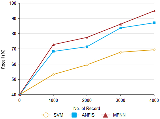 Figure 10 and Table 4 show that recall outperforms different ML methods for PD prediction. The proposed MFNN algorithm for predicting PD involves identifying true positives and false negatives. True positives refer to the actual cases of PD that the proposed method accurately determined. At the same time, false negatives are cases of PD that were incorrectly identified as non-Parkinson's. The proposed MFNN algorithm has 95.3% recall performance, whereas the existing system has 87.1%, and SVM has 69.4% recall performance for 4,000 records.