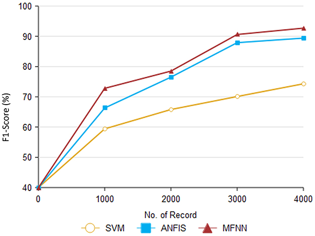 Furthermore, Table 5 and Figure 11 present F1-score performance with various classification methods. In predicting PD using the MFNN method, the F1 score is used to evaluate the proposed performance in terms of both precision and recall. It provides a balanced evaluation of the proposed performance, indicating how well it makes accurate positive predictions while capturing a high proportion of actual positive instances. The proposed MFNN algorithm achieved the highest F1-score for predicting PD, outperforming the other methods. In comparison, SVM achieved 74.3% and ANFIS reached 89.4% on the same dataset consisting of 4,000 records.