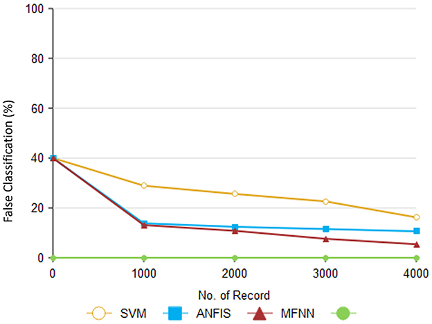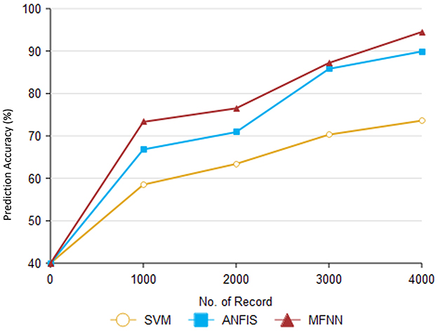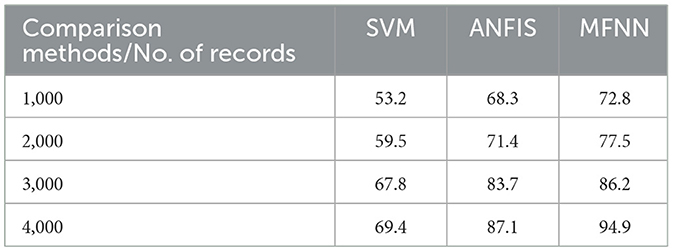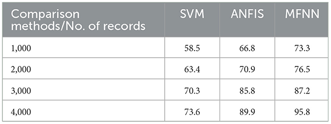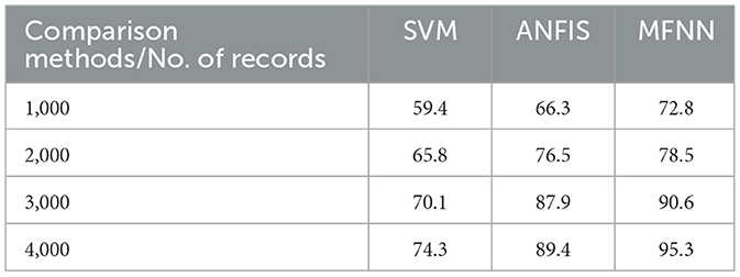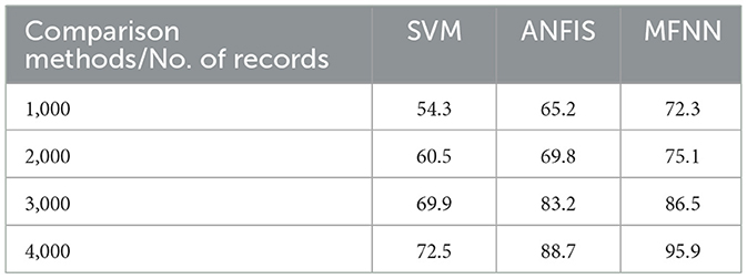 Figure 12 and Table 6 describe the overall MFNN method to predict PD in various records. It can handle 4,000 records and achieve PD classification accuracy of 95.8% with the proposed MFNN algorithm. The classification results improved as the dataset size increased. Similarly, the traditional SVM method classification result is 73.6%, and the ANFIS method classification result is 89.9%.