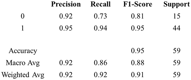 Figure 14 discusses PD prediction and classification, along with the pathology. The MFNN model, as proposed, demonstrated a precision rate of 0.95, a recall rate of 0.94, an F1-score of 0.95, and an accuracy rate of 0.95.