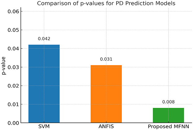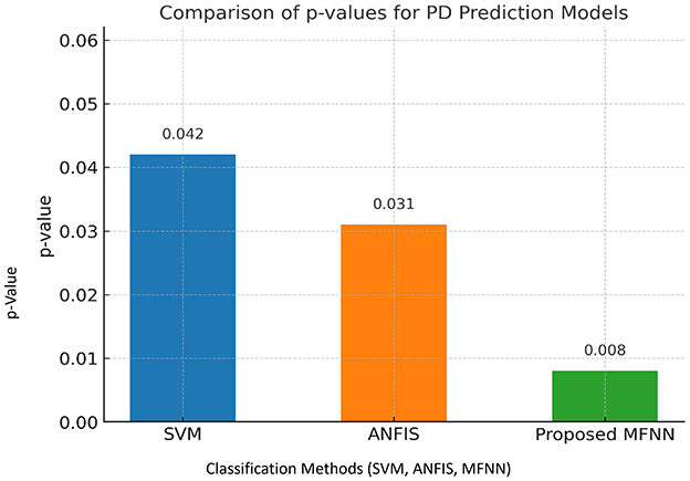 Figure 17 demonstrates the performance of the p-value comparison result. The lowest p-value (0.008) was in the proposed MFNN model. Here, the statistical significance of the MFNN results is high, indicating that it is more effective and its predictions are less prone to coincidence. The SVM model is the least significant model with the highest p-value (0.042). ANFIS performs quite well, with a p-value that is higher than the SVM but lower than the MFNN model.