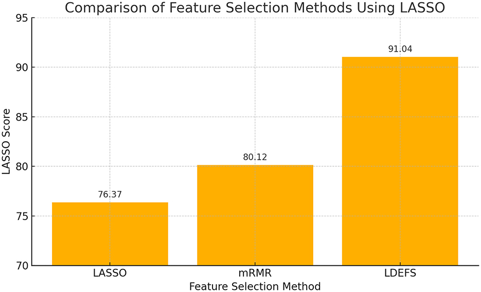 Figure 16 demonstrates the feature selection performance for PD prediction with different methods. The proposed method attains 91.04% of feature selection performance, while the traditional methods, Least Absolute Shrinkage and Selection Operator (LASSO) and Minimum Redundancy Maximum Relevance (mRMR), obtained 76.37% and 80.12%, respectively.