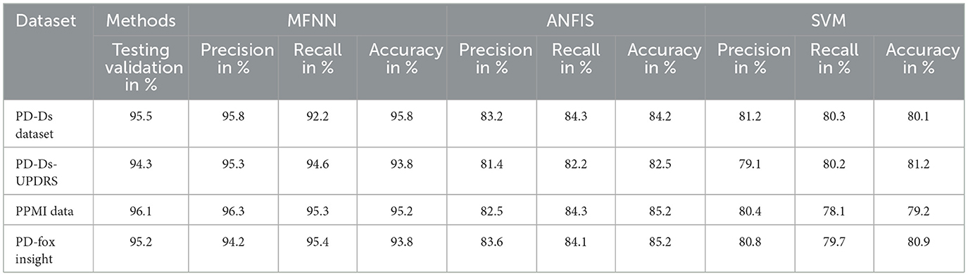 An ANFIS algorithm based on IoT and cloud environments was presented as a novel method for detecting PD using ML (Khan and Algarni, 2020). Adaptive Neuro-Fuzzy Inference System (ANFIS) learning is robust to gradient-trapped local minima. Using Modified Salp Swarm Optimization (MSSO) to optimize learning parameters can improve ANFIS results. Furthermore, another study examined the ANFIS method and a hybrid algorithm for PD identification. At the edge of local community gateways, fog computing gathers, analyzes, and transmits data in real time (El-Hasnony et al., 2020). Despite this, most methods produce lower prediction performance. The author focused on the previous problem; therefore, the study introduced fuzzy neural systems for PD identification. A fuzzy neural system (FNS) is proposed to provide structural and learning mechanisms. The innovative approach aims to enhance the system's effectiveness and effectively distinguish between healthy individuals (Rahib and Abiyev, 2016).