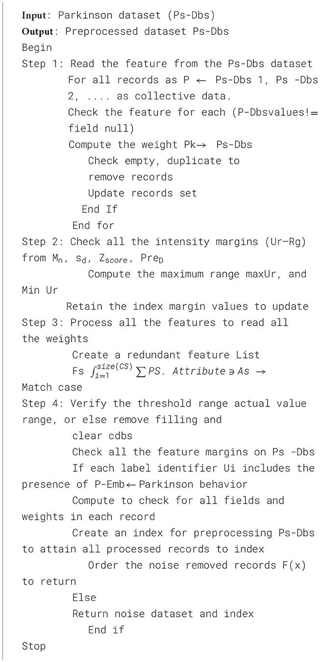 Parkinson's disease cumulative scores may not be accurate because they contain missing values. Hence, the Z-score normalization method is applied to correct the dataset. The normalization algorithm removes irrelevant and missing values based on the mean and standard deviation.