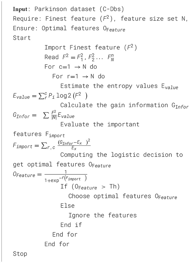 Algorithm 2 describes how to obtain optimal PD prediction features based on the LDEFS technique. Initially, estimate the entropy values evaluated, then calculate the disease feature gain information, GInfor. Afterwards, the important features in the processed dataset will be evaluated. Next, we obtain optimal features based on logistical decisions. It selects the most appropriate values for the disease when the feature value exceeds the threshold value; otherwise, it ignores it. Assuming that P refers to probability, Ex refers to expected feature values, and the threshold value of 0.85. The threshold is 0.85 corresponds to features with a high logistic decision correlation. The features at this level and below will be weaker relative to the model's decision boundary.