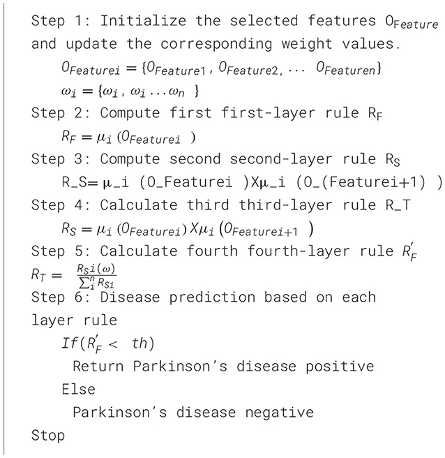 Figure 6 defines the process of the MFNN for PD prediction. Each layer has rules for disease prediction, and these layers extract essential features to reduce feature dimensions. The weight parameter is fine-tuned using the membership function. Finally, the layers are included in the decision-making process.