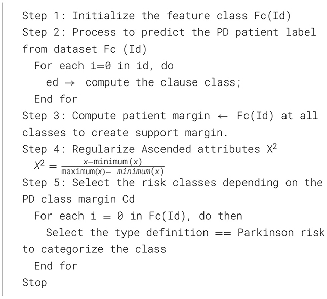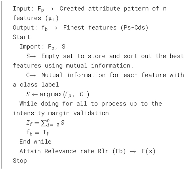 The relationship between each feature and the optimal feature fb, derived from the pattern Fp, is restrained, and the article weight fb is examined. Atlas, the supreme attribute of heaviness designs, is organized and made the fb done restatement in Algorithm 4. The algorithm uses a mutual information sorting method to determine features that best correlate with Parkinson's disease. The fuzzy membership functions are generated using the final feature subset (fb) in the MFNN, enabling efficient and interpretable risk classification of PDs. The remarkable one-way process maximizes classification performance by minimizing noise, redundancy, and overfitting.