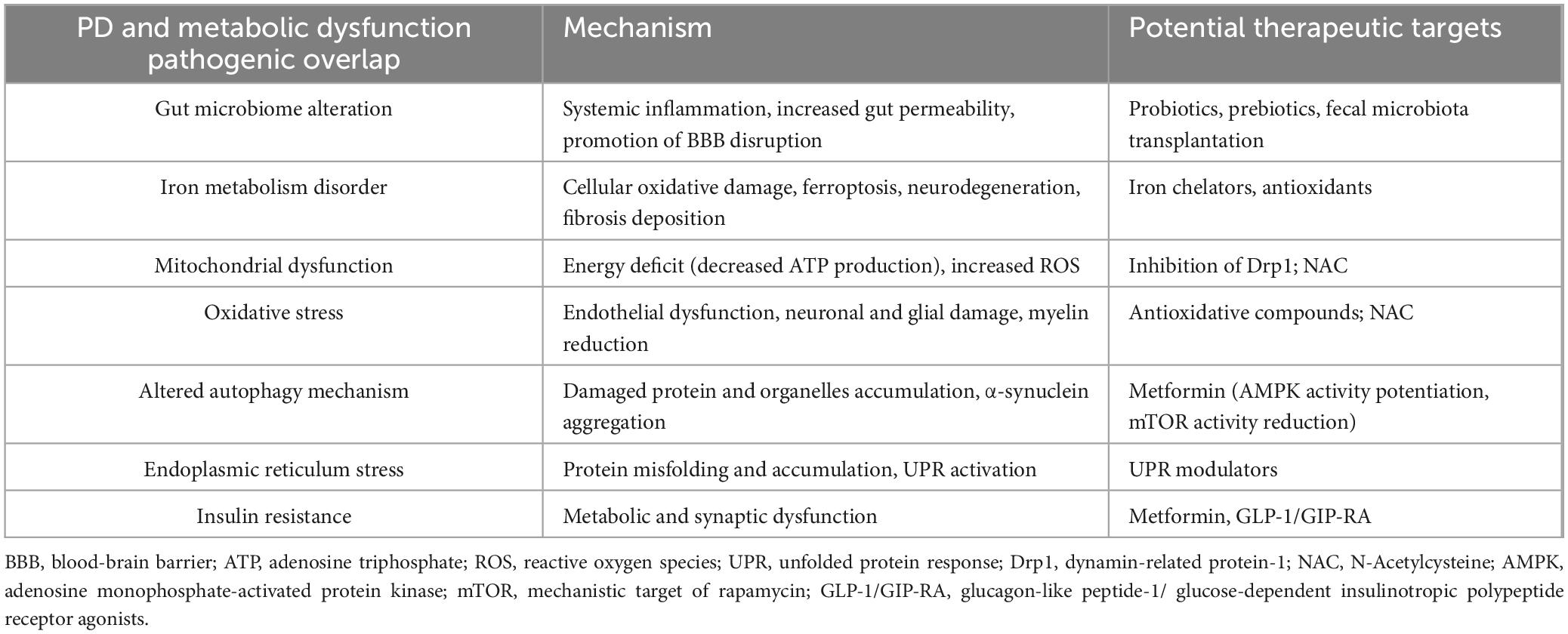 In the spectrum of parkinsonian disorders, attempts to classify disease subtypes based on cluster of clinical features have been made (Marras and Lang, 2013), as well based on etiology. Some cases are sustained by genetic variants whereas other forms are idiopathic. Among monogenic variants for example, GBA1-associated PD is increasingly recognized and studied as an entity with earlier onset and rapid progression (Skrahin et al., 2024). Although the proportion of PD patients harboring pathogenic genetic variants is significant, with estimates ranging from 5%–15% to over 40% (Lim et al., 2024), most cases are sporadic. It is therefore assumed that diverse genetic, epigenetic, and environmental factors interact in a complex manner to affect disease risk and progression (Gundogdu et al., 2021; Roverato et al., 2021; Sircar et al., 2021).However, the mechanisms underlying the onset of sporadic PD remain unclear, with aging being a primary risk factor (Gundogdu et al., 2021). Interestingly, epidemiological, preclinical, and clinical data suggest an association between Type 2 diabetes mellitus (T2DM) and an increased risk or accelerated progression of PD signs and symptoms (Ribarič, 2024; Stockmann et al., 2025), with motor symptoms being especially affected (Chen et al., 2025; Kotagal et al., 2013). This supports the idea that insulin resistance (IR) and chronic inflammation contribute to the overlapping aetiologies of T2DM and PD. Insulin may play a key role in many processes that could be dysregulated in both diseases, including apoptosis, autophagy, mitochondrial dysfunction, oxidative stress, neuroinflammation, and synaptic plasticity (Cullinane et al., 2023; Yan et al., 2023; Figure 1). Furthermore, obesity and metabolic syndrome (MetS) also appear to be risk factors for the occurrence of PD through the same mechanism, namely systemic inflammation, insulin and leptin resistance, blood-brain barrier disruption, and altered brain metabolism (Neto et al., 2023; Table 1). Although these correlations are now known and consolidated, the exact mechanisms underlying the aetiopathogenesis and linking mechanisms remain unclear and data are heterogeneous. Future studies are therefore needed, especially to target prevention and subsequent treatment of PD through lifestyle interventions and the use of drugs with metabolic action. Indeed, the gold-standard therapy for the symptomatic treatment of PD is dopamine replacement therapy (DRT) with levodopa and other dopaminergic agents. Nonetheless, DRT does not address the underlying neurodegenerative processes that characterize PD and levodopa treatment can associate with motor fluctuations and dyskinesias, which largely impact the quality of life. Additionally, non-motor issues such as cognitive impairment and dysautonomia, pose major challenges with limited therapeutic strategies available.