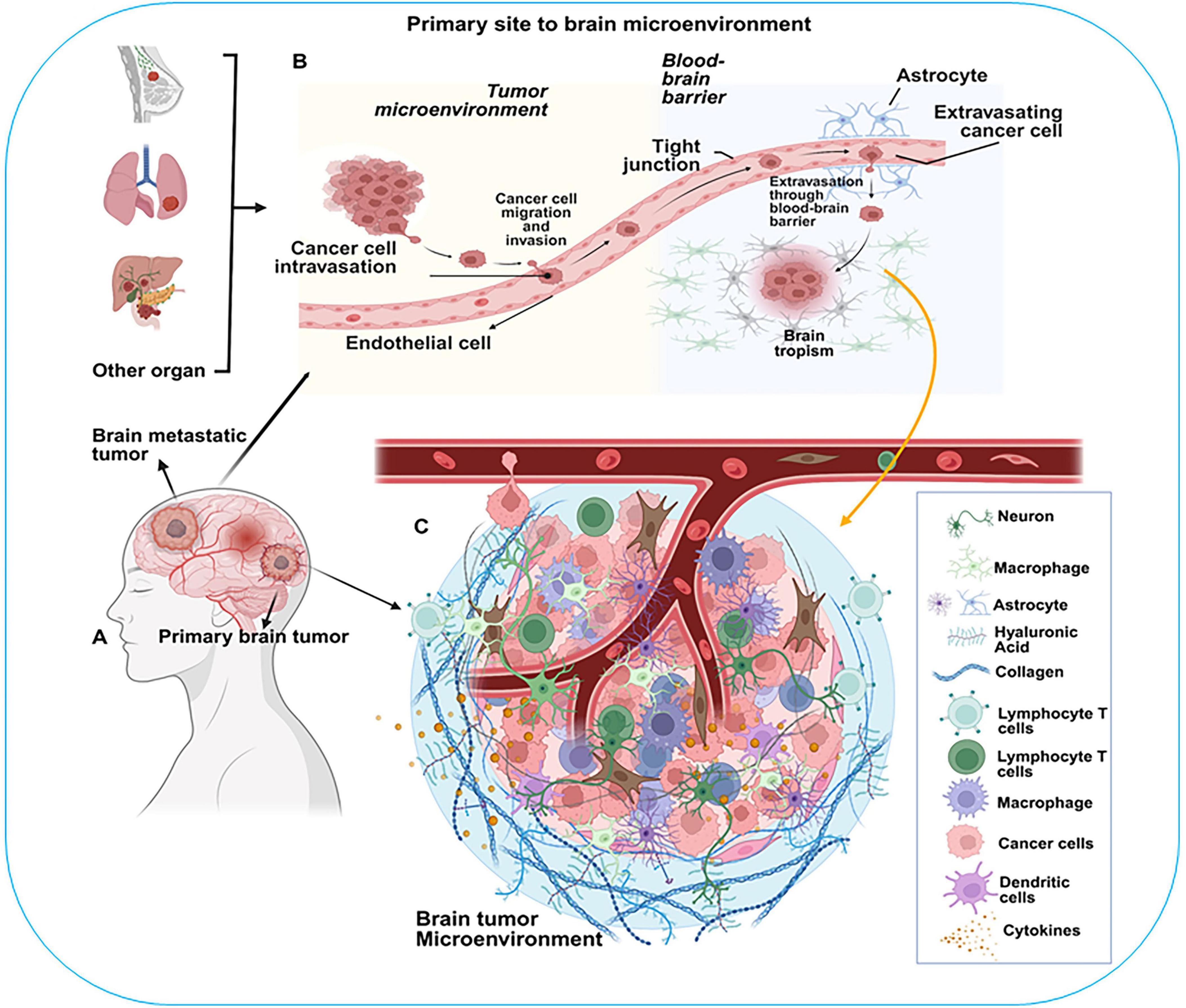 Figure 1. Diagram illustrating the process from primary tumor site to brain microenvironment. (A) Brain tumor categorization: primary or metastatica. (B) Cancer cell migration from other organs to the brain, highlighting cancer cell invasion, crossing the blood-brain barrier, and astrocyte interaction. (C) Brain tumor microenvironment with various cells: neurons, macrophages, astrocytes, lymphocyte T cells, cancer cells, dendritic cells, and cytokines.