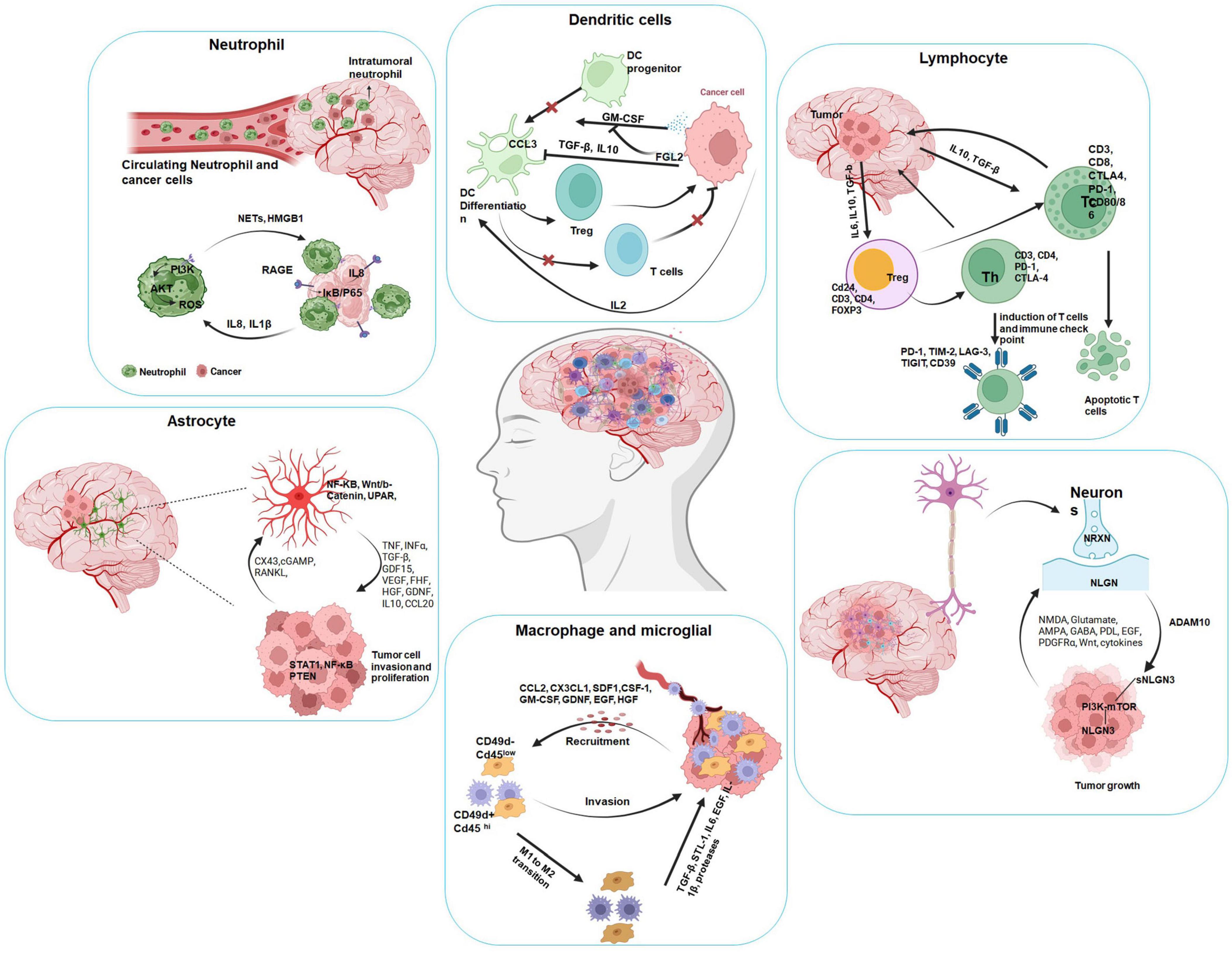 Figure 2. Diagram of brain tumor microenvironment interactions with various cell types. Panels depict neutrophils, astrocytes, lymphocytes, dendritic cells, macrophages, microglia, and neurons. Each panel illustrates cellular pathways and factors like cytokines, signaling molecules, and transcription factors involved in tumor progression, invasion, and immune regulation. Central image shows a brain with highlighted tumor regions. Arrows indicate interactions, signaling pathways, and cellular effects relevant to tumor biology.