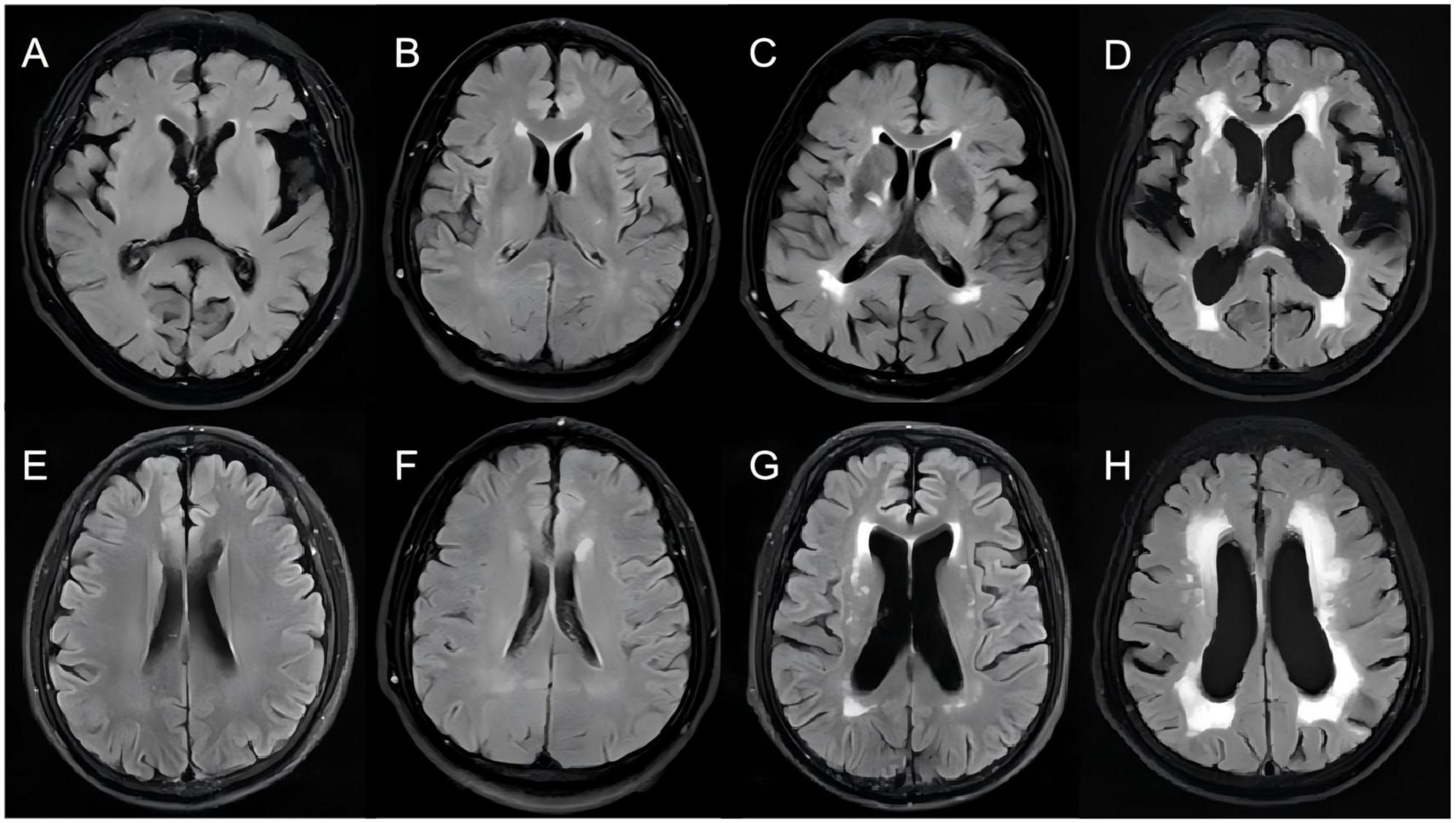 Figure 1. T2 FLAIR imaging reports of head MRI. Periventricular WMH (PVWMH) fazekas scores: (A) 0 points, (B) 1 point, (C) 2 points, (D) 3 points; Deep WMH (DWMH) Fazekas scores: (E) 0 points, (F) 1 point, (G) 2 points, (H) 3 points.