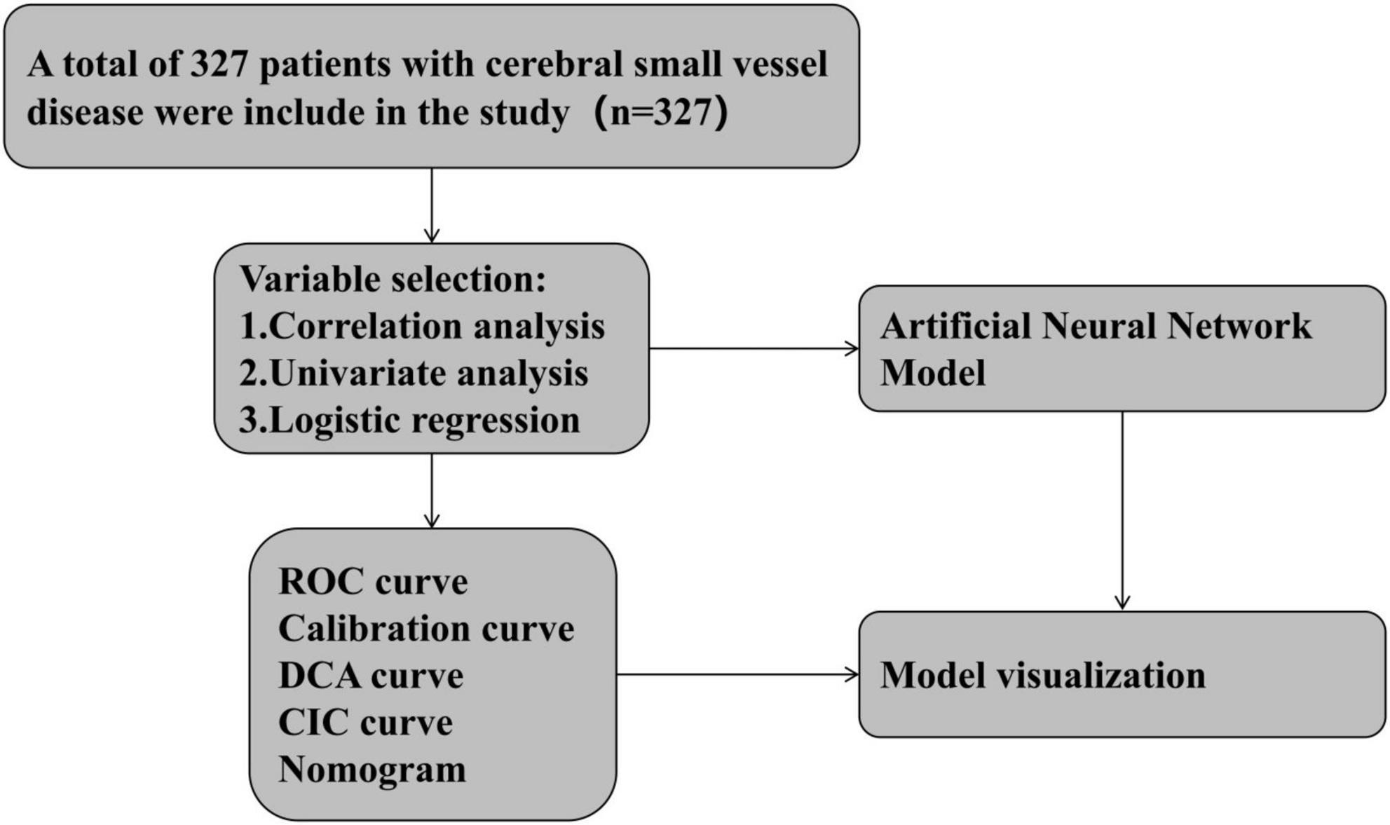 Univariate and multivariate logistic regression analyses were performed for variable selection. Variance inflation factor (VIF) analysis was applied to control multicollinearity, retaining variables with VIF < 5. The predictive model was evaluated based on the area under the receiver operating characteristic curve (AUC), calibration curves, decision curve analysis (DCA), and clinical impact curves (CIC) to assess its predictive performance and clinical utility. We further developed an artificial neural network model based on independent predictors from the logistic regression model, and conducted internal validation and model performance comparison. Model interpretability was examined using SHapley Additive exPlanations (SHAP), including feature importance rankings, beeswarm plots, and individual force plots. The complete experimental procedure is shown in Figure 2.