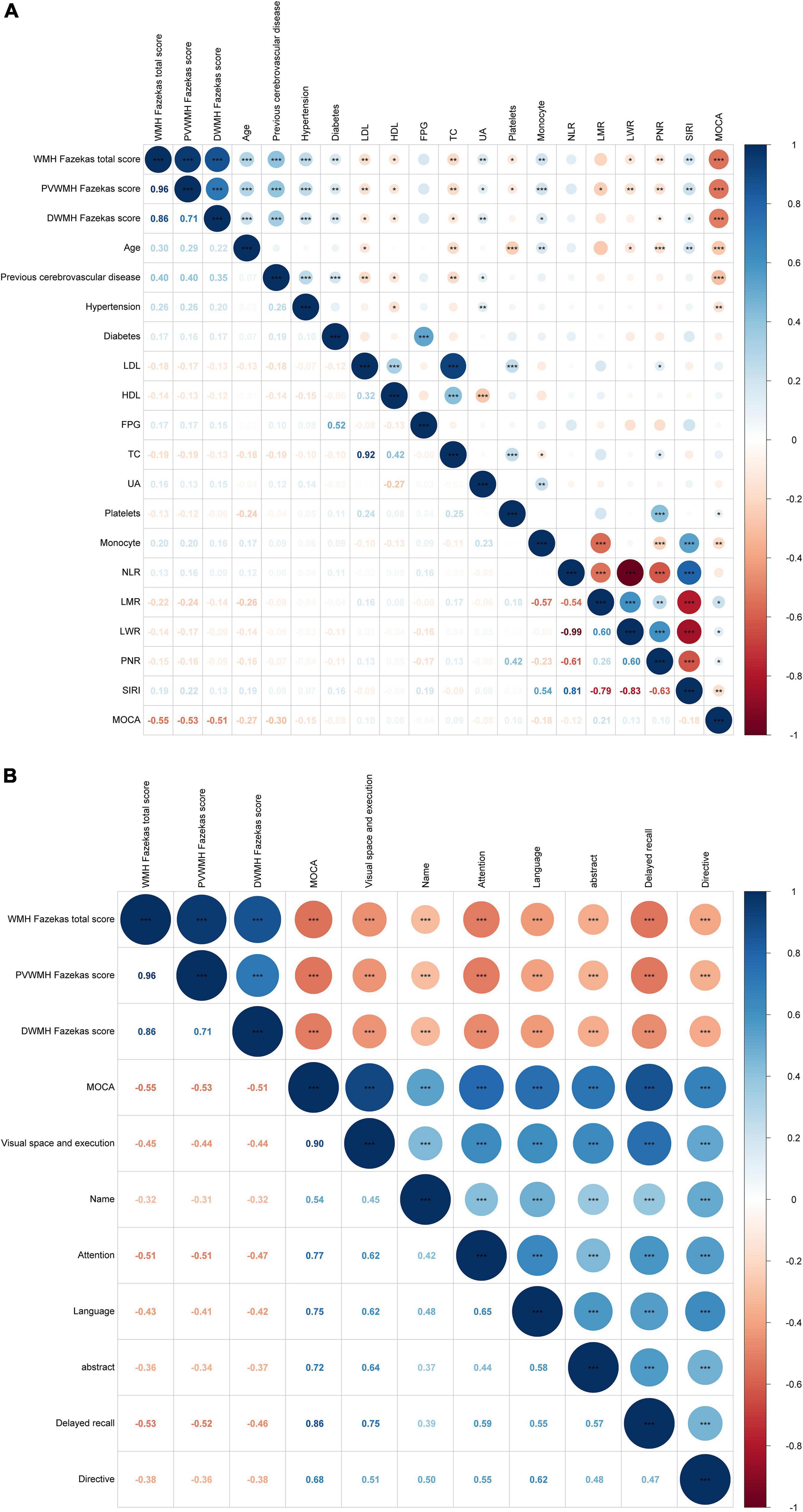Figure 3. (A,B) Spearman correlation heat map of WMH variables. The upper triangle of the figure shows the significant relationship between each variable, and the lower triangle shows the correlation coefficient. The size of the circle represents the correlation coefficient, and the depth of color represents the correlation coefficient (r-value), * <0.05; ** <0.01; *** <0.001.