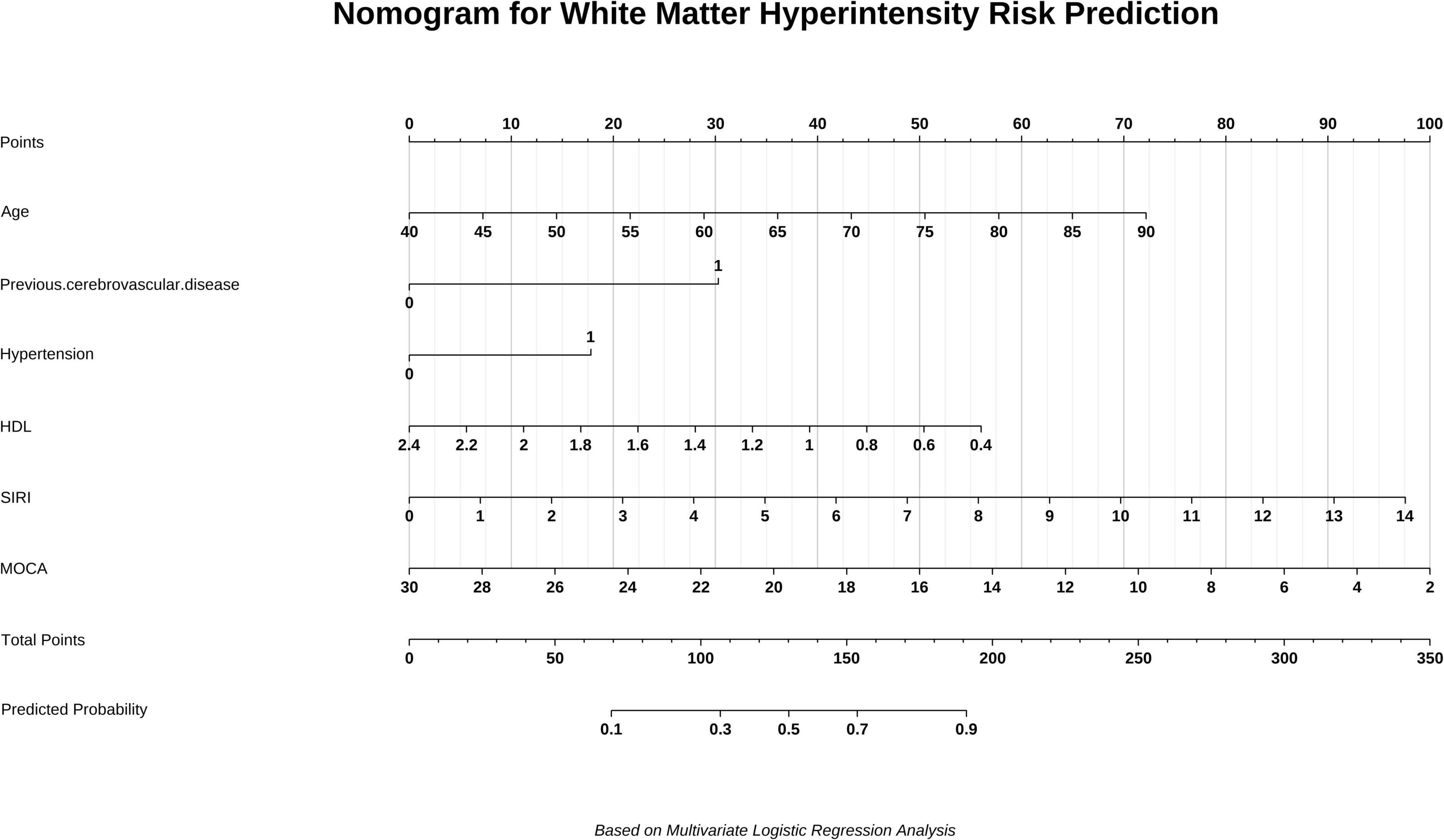 However, current clinical practice faces dual challenges: the high cost of multi-sequence MRI restricts its widespread application in primary care settings, and the precise mechanisms linking inflammatory markers to WMH remain incompletely elucidated. This study aims to systematically explore the relationship between systemic inflammatory markers (including SII, NLR, etc.) and WMH burden, construct a predictive model integrating clinical data and inflammatory indices, and thereby provide an evidence-based foundation for early WMH screening and intervention. The findings provide an important basis for optimizing diagnostic-therapeutic pathways and promoting the clinical translation of community-based WMH prevention and management strategies.