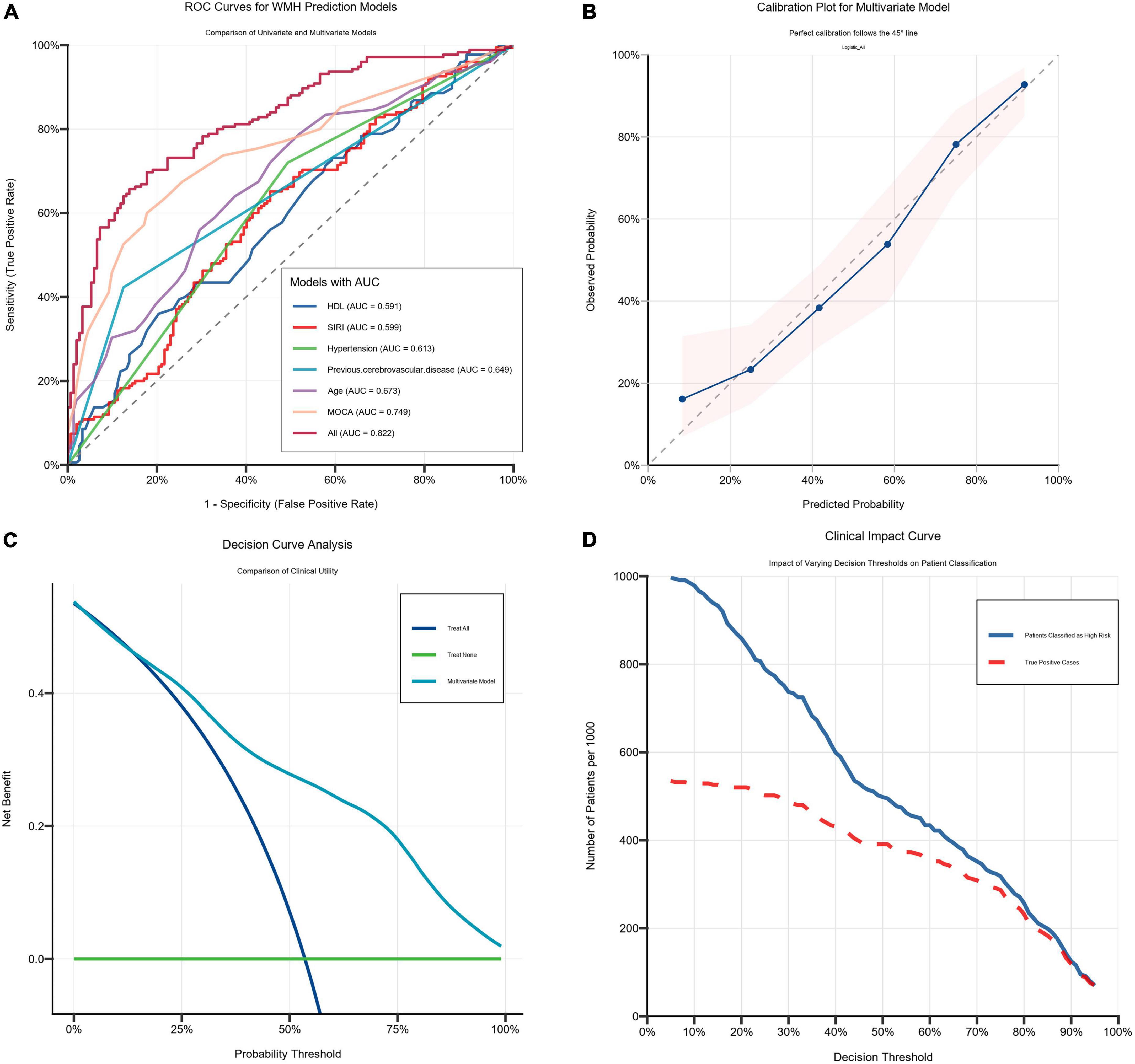In summary, this study developed and validated a predictive model integrating metabolic parameters with complete blood count-derived inflammatory markers, and systematically demonstrated the combined value of SIRI and MoCA score in predicting moderate-to-severe WMH. Furthermore, we established a clinically-based risk stratification model and conducted mechanistic analysis of the incorporated variables. Future studies should prioritize external validation through multicenter cohort studies, which represents a crucial step for verifying the model’s clinical utility across broader populations. Additionally, exploration of interventions targeting SIRI modulation and in-depth investigation into the mechanistic effects of metabolic and inflammatory factors on WMH progression are warranted.