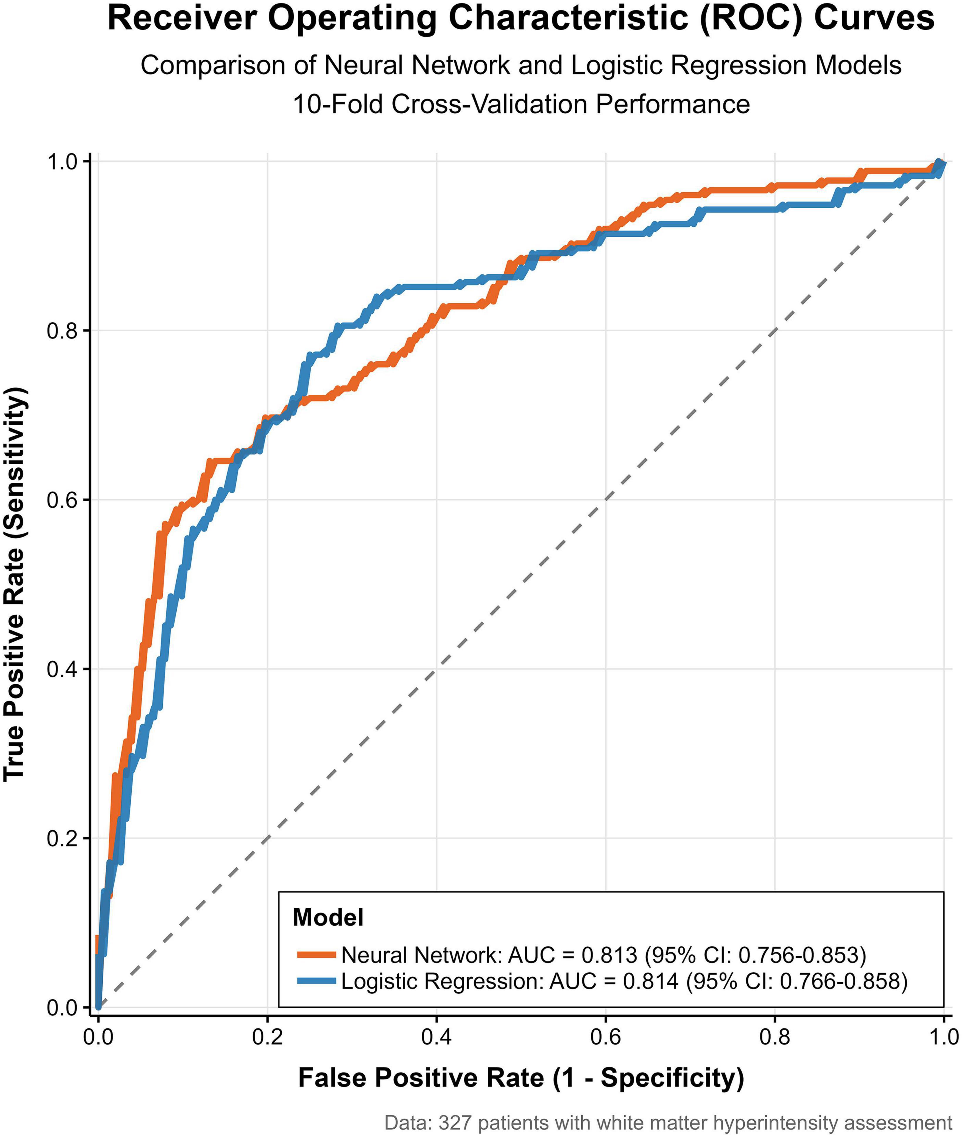 Using the independent predictors from the logistic regression model, an artificial neural network was developed (Figure 6). Both models demonstrated comparable discriminatory performance in 10-fold cross-validation (DeLong test, P = 0.587), with AUCs of 0.813 (95% CI: 0.756–0.853) for the neural network and 0.814 (95% CI: 0.766–0.858) for the logistic regression model.