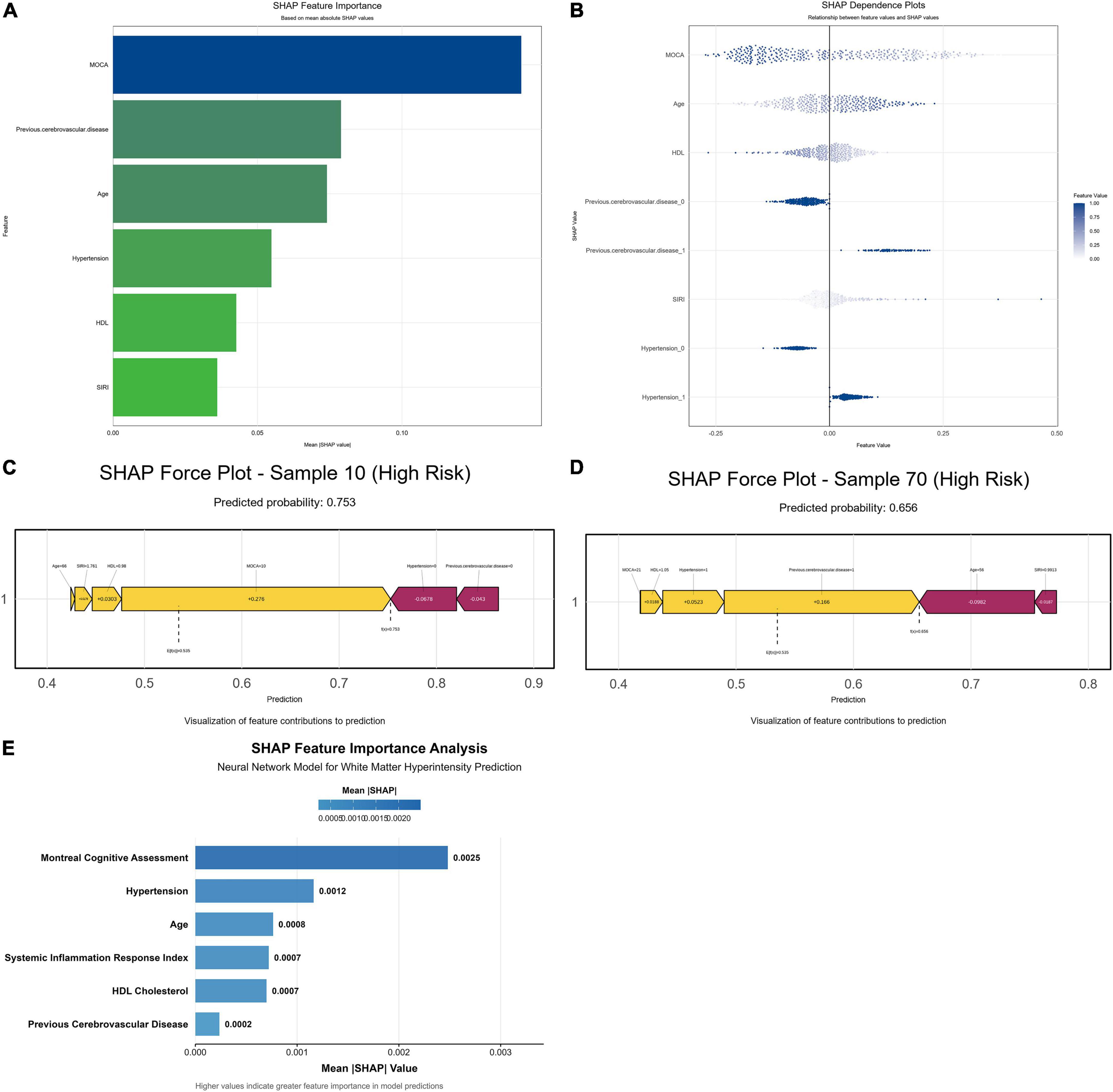 Results: Correlation analysis revealed a significant association between the systemic inflammation response index (SIRI) and WMH burden (P< 0.01). Multivariate logistic regression analysis identified age, hypertension, high-density lipoprotein (HDL), previous cerebrovascular disease, the systemic inflammation response index (SIRI), and the Montreal Cognitive Assessment (MoCA) score as independent predictors of WMH burden. Ten-fold cross-validation showed that the set neural network model performed as well as the logistic regression model (AUC = 0.824). SHAP-based visual analysis identified age, MoCA score, and hypertension as key driving factors.