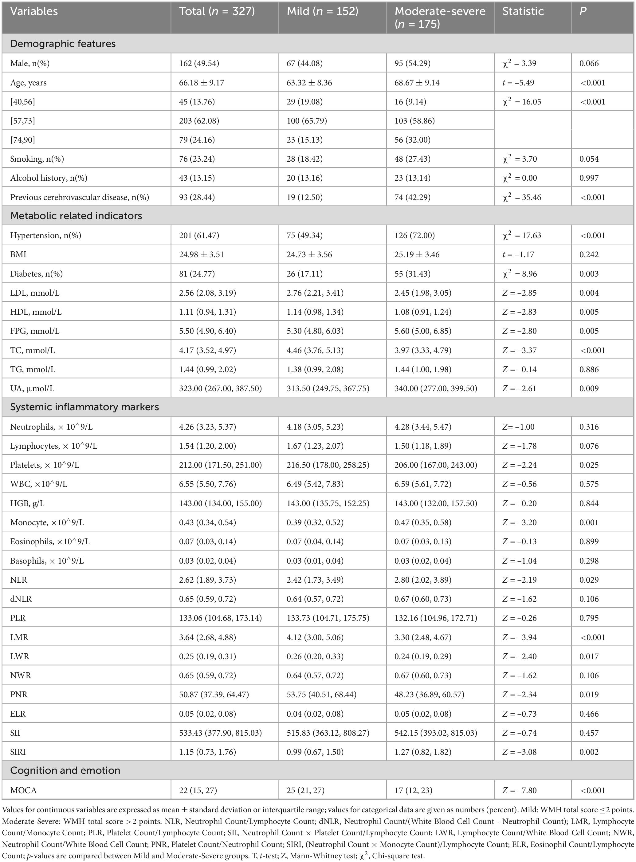 A total of 327 patients with WMH were enrolled, including 152 with mild WMH and 175 with moderate-to-severe. No significant differences were observed between WMH severity groups in terms of sex, smoking status, alcohol consumption, or triglyceride levels (P > 0.05). However, significant differences were observed in age, and the prevalence of diabetes, hypertension, and cognitive impairment between the two groups (P< 0.05). Compared to the mild WMH group, the moderate-to-severe group showed significantly lower levels of low-density lipoprotein cholesterol (LDL-C, p = 0.004), high-density lipoprotein cholesterol (HDL-C, p = 0.005), total cholesterol (TC, p < 0.001), lymphocyte-to-monocyte ratio (LMR, p < 0.001), and platelet-to-neutrophil ratio (PNR, p = 0.019), along with significantly higher levels of fasting plasma glucose (FPG, p = 0.005), uric acid (UA, p = 0.009), neutrophil-to-lymphocyte ratio (NLR, p = 0.029), and systemic inflammation response index (SIRI, p = 0.002) (Table 1).