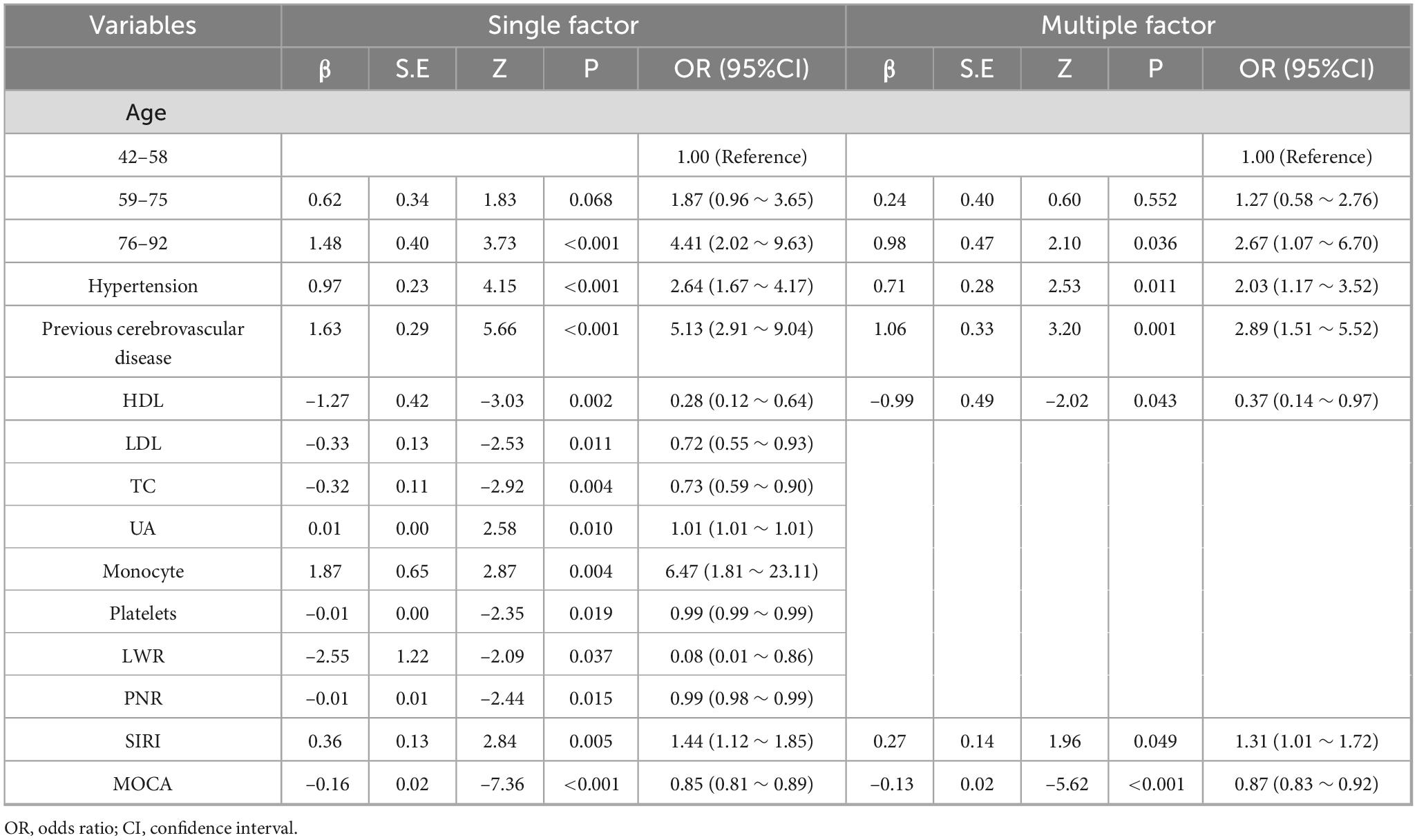 Comprehensive demographic data, including age, sex, and lifestyle factors, were collected for each patient. Laboratory tests at admission included complete blood count, fasting plasma glucose (FPG), low-density lipoprotein cholesterol (LDL-C), and other relevant parameters. Cognitive function was assessed using the Montreal Cognitive Assessment (MoCA) (Salvadori et al., 2021). Several systemic inflammatory markers were calculated, including: neutrophil-to-lymphocyte ratio (NLR = neutrophil count/lymphocyte count), derived neutrophil-to-lymphocyte ratio [dNLR = neutrophil count/(white blood cell count − neutrophil count)], lymphocyte-to-monocyte ratio (LMR = lymphocyte count/monocyte count), platelet-to-lymphocyte ratio (PLR = platelet count/lymphocyte count), systemic immune-inflammation index (SII = neutrophil count × latelet count/lymphocyte count), lymphocyte-to-white blood cell ratio (LWR = lymphocyte count/white blood cell count), neutrophil-to-white blood cell ratio (NWR = neutrophil count/white blood cell count), platelet-to-neutrophil ratio (PNR = platelet count/neutrophil count), systemic inflammation response index [SIRI = (neutrophil count × monocyte count)/lymphocyte count], and eosinophil-to-lymphocyte ratio (ELR = eosinophil count/lymphocyte count). All data were collected by trained neurologists at the First Affiliated Hospital of Baotou Medical College, with strict confidentiality measures implemented to protect participant information throughout and after data collection.
