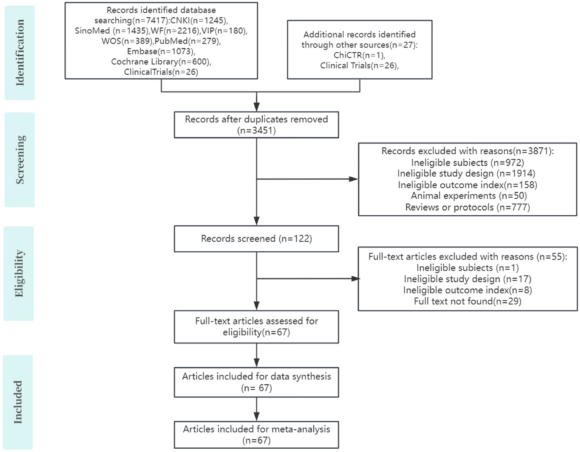 Following initial database searches, we identified 7,444 potentially relevant studies. After removing 3,451 duplicate records, 3,993 articles remained for title/abstract screening. This yielded 122 articles for full-text evaluation, from which 55 were excluded. Ultimately, 67 RCTs met inclusion criteria for this systematic review (Li L. Y. et al., 2021, 2022; Cui et al., 2021; Xu et al., 2015; Wang J. M. et al., 2021; Wang et al., 2023; Zhang et al., 2024, 2010; Xu, 2020; Yan, 2022; He et al., 2023; Hsieh et al., 2007; Gong and Xie, 2022; Bi et al., 2022; Wei et al., 2023; Liu et al., 2005; Lv et al., 2003; Ji, 2023; Xu et al., 2019; Yan et al., 2017; Wu et al., 2022; Yang et al., 2007; Liu, 2024; Bai et al., 2013; Tang et al., 2016; Yang, 2019; Zhong, 2021; Hou and Xu, 2022; Chen and Guan, 2022; Yu and Tian, 2023; Lang et al., 2013; Sun and Tu, 2024; Cao, 2022; Huang and Ou, 2021; Sun, 2020; Yin, 2021; Chen et al., 2014; Ding, 2024; Shen and Zou, 2025; Han and Shi, 2023; Wang, 2021; Pan and Jin, 2021; Xian et al., 2022; Ban et al., 2019; Kong, 2023; Xu, 2017; Ye et al., 2019; Xiong et al., 2020; Song, 2019; Zhang and Wang, 2019; Sang et al., 2023; Guo and Liu, 2022; Wang and Gong, 2022; Hou and Gao, 2024; Wang, 2022, 2024; Lu et al., 2025; Sha and Ma, 2020; Wu and Zhang, 2016; Yan et al., 2024; Qian, 2023; Liu et al., 2019; Li C. Y. et al., 2022; Zhou et al., 2023; Wang F. Q. et al., 2021; Fan et al., 2023; Li and Yuan, 2024). The selection flowchart is presented in Figure 1.