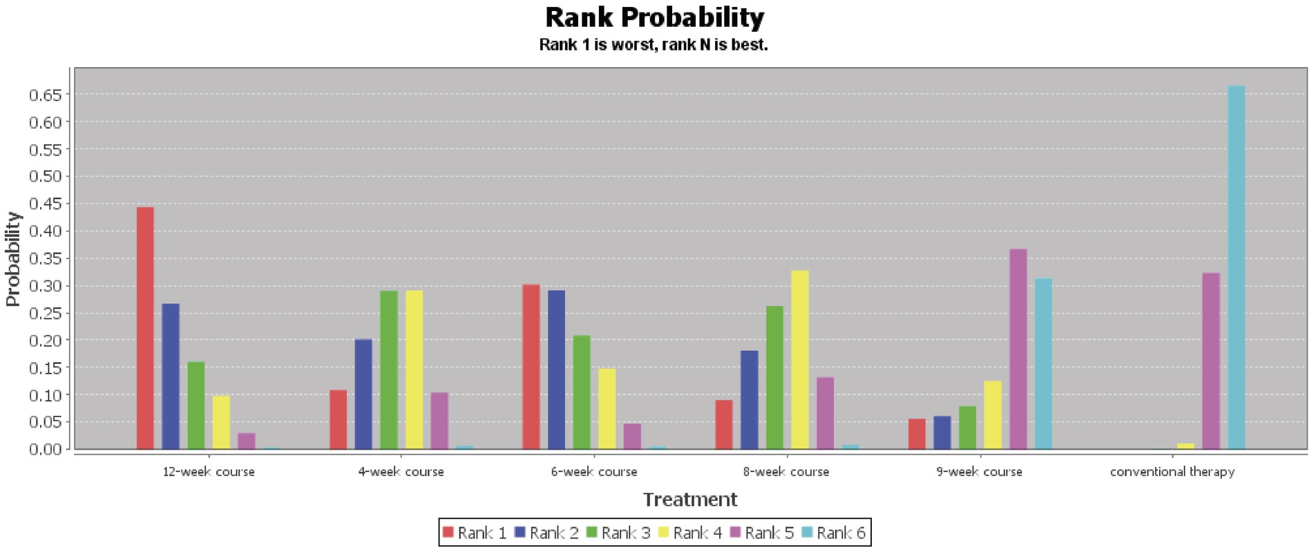 Based on the PSRF results (values approximating 1), see in Supplementary file S7. Both consistency and inconsistency models were employed for network meta-analysis (NMA) with Monte Carlo simulation iterations. The random-effects standard deviation was found to be approximately equal to the inconsistency standard deviation. We therefore selected the consistency model for the final network meta-analysis and generated rank probability plots (Figure 10). As shown in Figures 10, 11, 8-week course, 4-week course, and 9-week course acupuncture interventions ranked as the top three treatments in this study. Among the four acupuncture treatment courses evaluated, 8-week acupuncture course was identified as the most effective regimen for improving MBI scores.