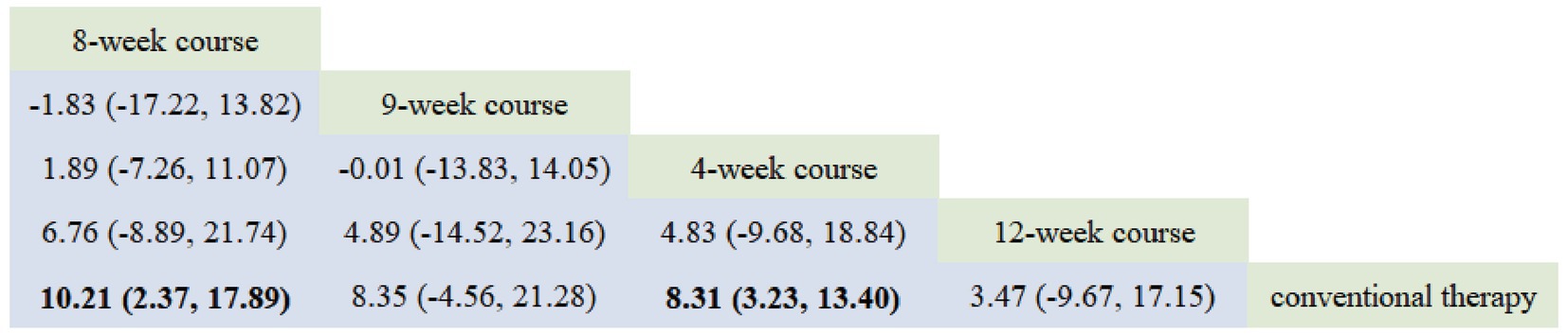 Considering the high degree of heterogeneity (I2 = 91%) among studies, we conducted subgroup analyses by intervention duration (4-week course, 8-week course, 9-week course, and 12-week course subgroups). All subgroups showed significantly better therapeutic effects than the control group (p < 0.05). See Supplementary file S4.