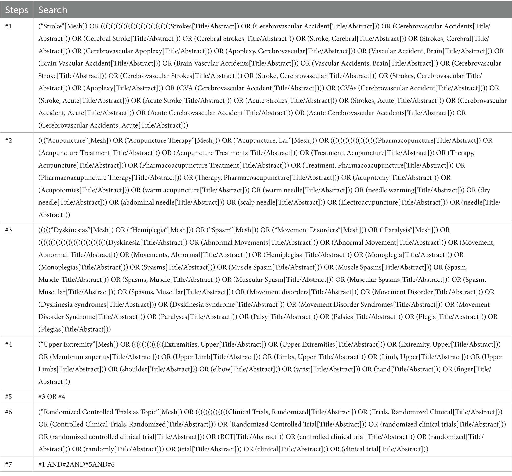 To ensure comprehensive literature retrieval, this study systematically searched eight databases, including PubMed, Web of Science, Embase, the Cochrane Library, ClinicalTrials.gov, China National Knowledge Infrastructure (CNKI), VIP Database, Wanfang Data, the Chinese Biomedical Literature Database (CBM), and the Chinese Clinical Trial Registry. The search period spanned from each database’s inception to March 21, 2025. To ensure an effective search, a combination of Medical Subject Headings (MeSH) and free words will be used. Boolean operators “AND” and “OR” were strategically combined between search terms. The search strategy was adapted to each database’s specific requirements, with PubMed serving as the representative example. Detailed search strategies are provided in Table 1.