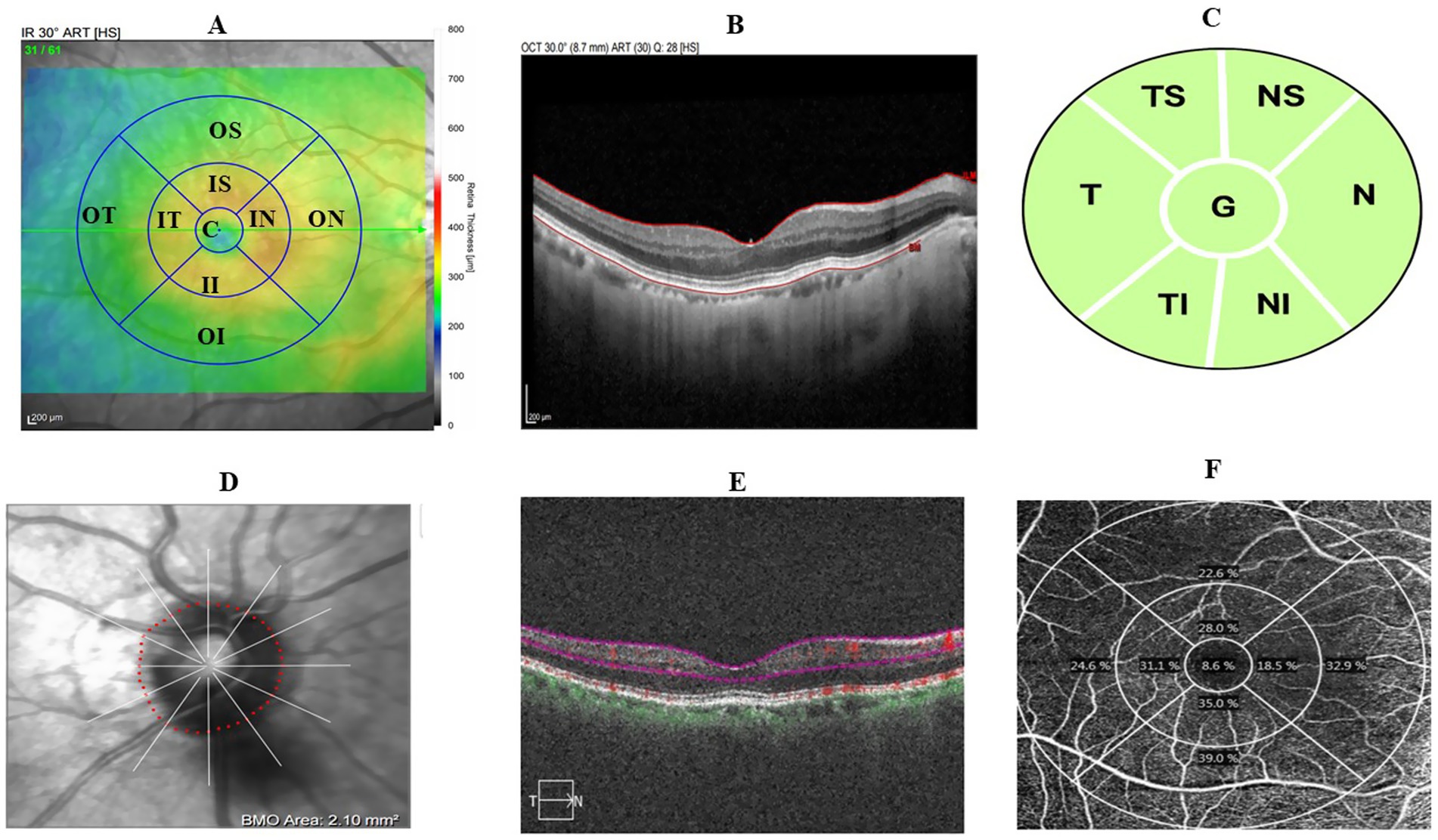 Figure 1. Retinal image scanning region based on the ETDRS grid. (A) Macular-centered scan showing 9 ETDRS grid. (B) Sample macular thickness segmentation. (C) Macular superficial vascular layer segmentation. (D) Sample macular superficial vascular layer map illustrating perfusion and vessel density. (E) Optic disc-centered scan of pRNFL thickness in 7 subregions of interest. (F) Sample optic disc-centered scan.