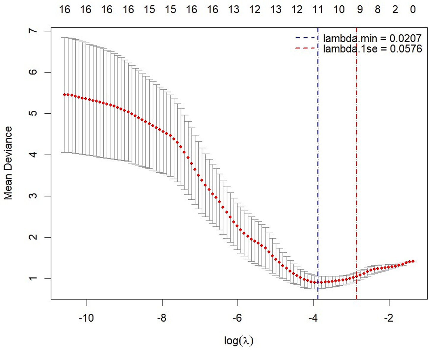 Figure 2. LASSO regression analysis with 10-fold cross-validation with a minimum error criterion to determine the optimal penalization estimate of λ.