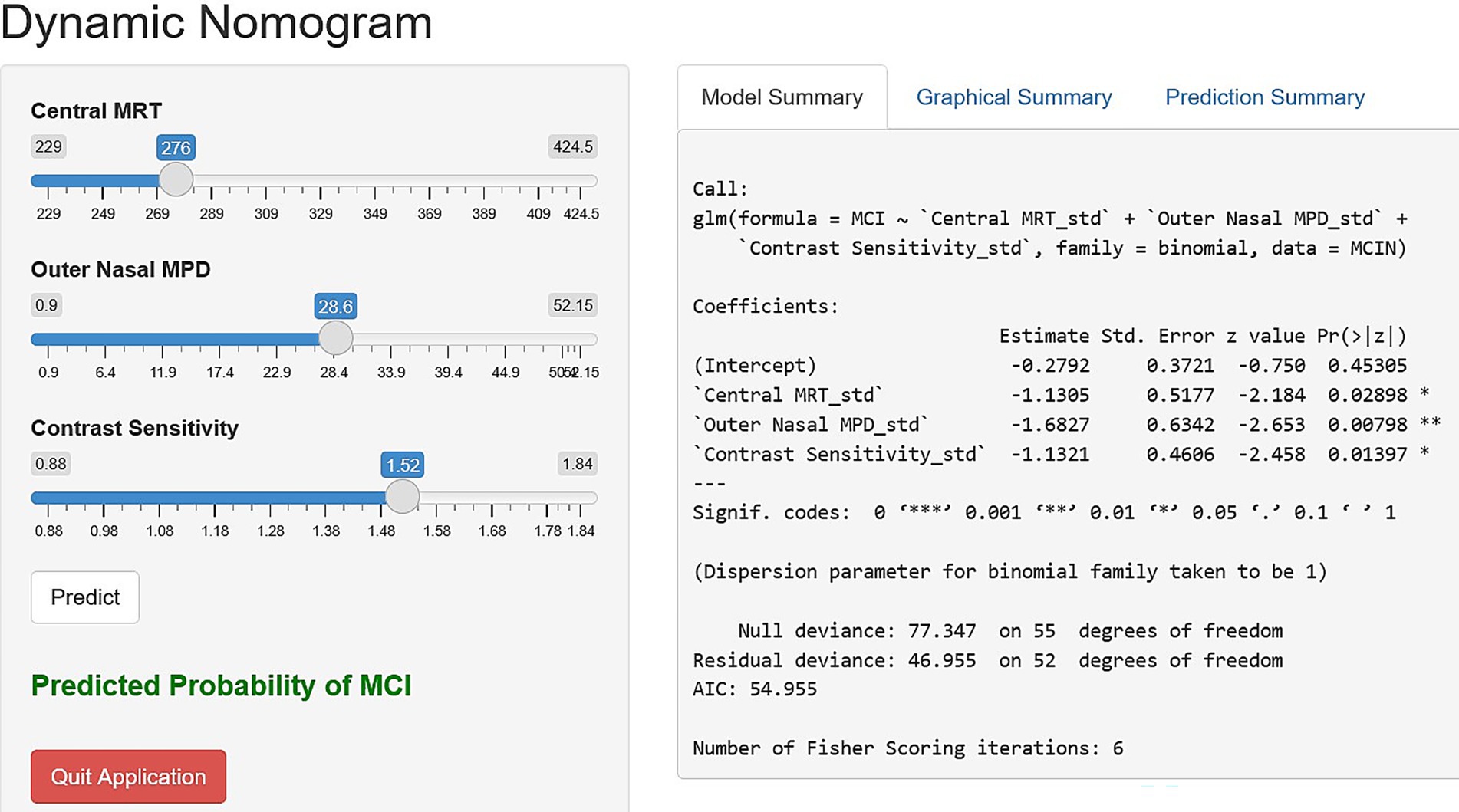 Based on the final regression model, a nomogram incorporating central MRT, outer nasal MPD, and contrast sensitivity was constructed using the “rms” package to predict the occurrence of MCI among older adults. Construction of the nomogram involved computing the total score and the prediction index scores for each variable using the ratio method. The risk contribution of each predictor at a given observed value was scalled between 0 to 100 points, and the sum of prediction index scores for each variable contributed to the total score. Higher total scores indicated a higher risk of MCI. Furthermore, a dynamic nomogram app was also developed using the “DynNom” packages to visualize statistical models. Subsequently, the “rsconnect” function was run to deploy on a web server at https://mciprediction.shinyapps.io/MCIAPP1/. This web-based calculator has a user-friendly interface that allows manipulation of the predictors’ observed values and computation of the corresponding predicted probability of MCI (Figure 3).