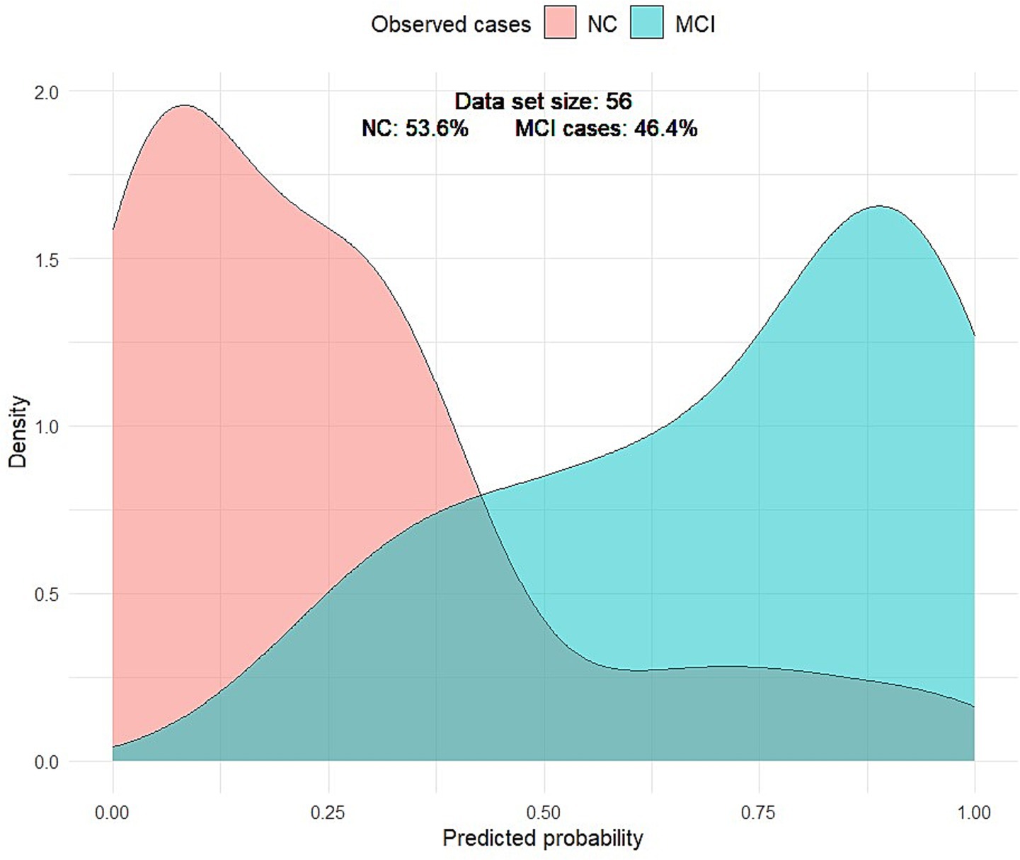 Visually, the density plot against predicted probabilities was bimodal, with two distinct peaks, reflecting the concentration of observed cases across two distinct probability ranges. Low probabilities indicate NC, and higher predictive probabilities represent MCI. This bimodality indicated that the model performed well in distinguishing MCI from NC (Figure 4).