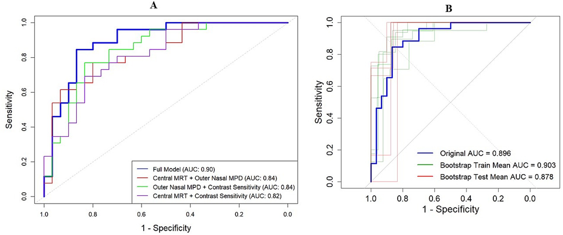 Figure 5. Model discrimination power indicated by AUC. (A) Model discrimination in the original dataset. The red curve represents AUC by combining outer nasal MPD and central MRT. The green curve indicates the AUC by combining nasal MPD and contrast sensitivity, while the pink curve denotes the AUC by combining central MRT and contrast sensitivity. The bold blue curve represents the AUC of the full model for detecting MCI among older adults. (B) Model discrimination in the bootstrap training (green curve) and testing (red curve) dataset compared to the original AUC (blue curve).