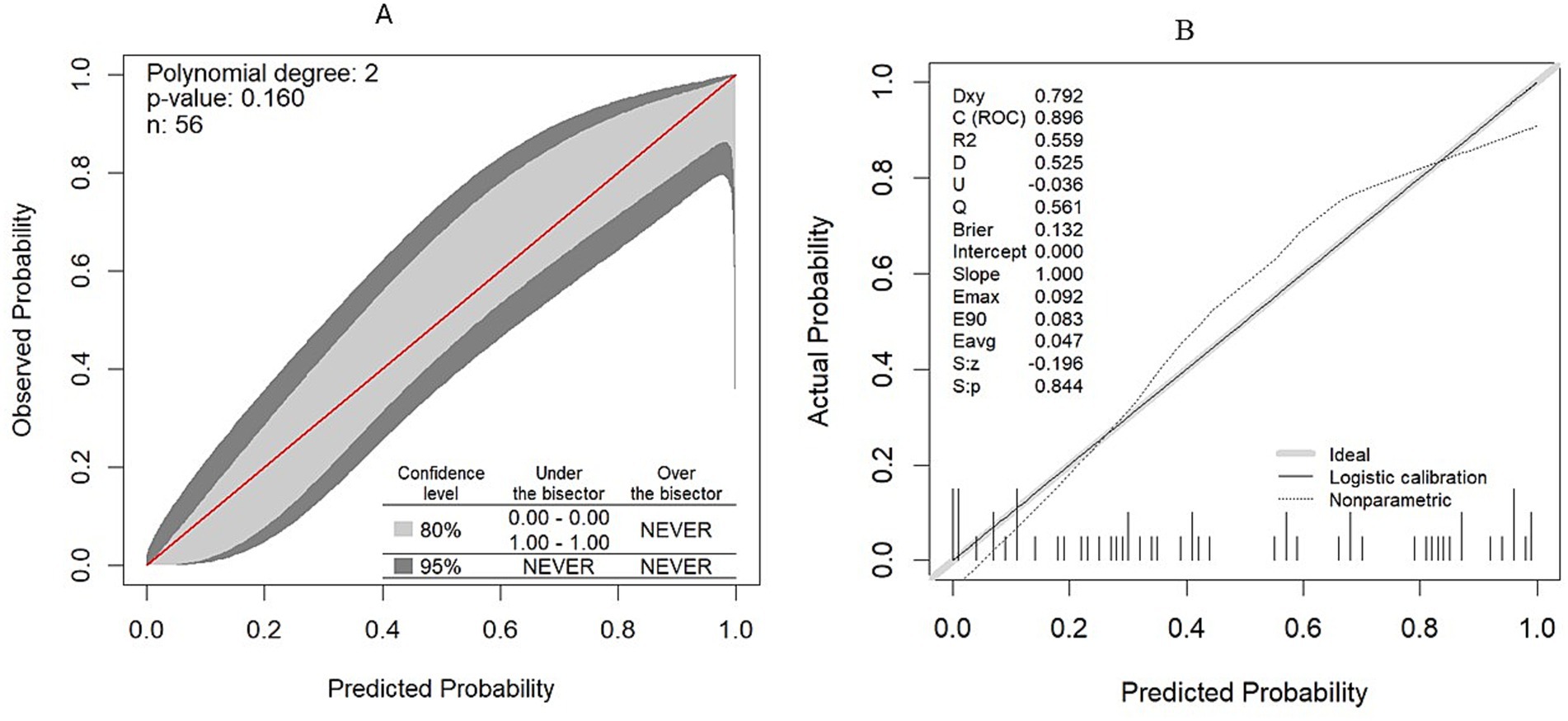 The calibration plot also showed no significant deviation, as the actual calibration curve (the gray-shaded area) was evenly bisected by the ideal calibration curve (the red line), indicating no significant under- or over-confidence, with a 95% confidence interval (p > 0.05). Following bootstrap validation, the model also showed no evidence that the bias-corrected calibration line deviates significantly from the ideal 45-degree line (Z = −0.196, p = 0.844), indicating good calibration with the test dataset (Figures 6A,B).