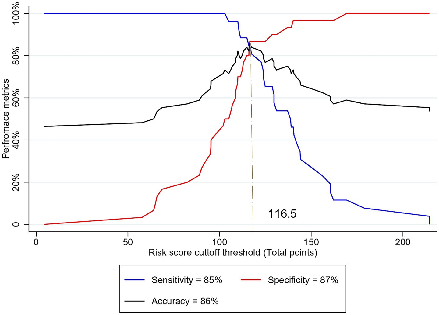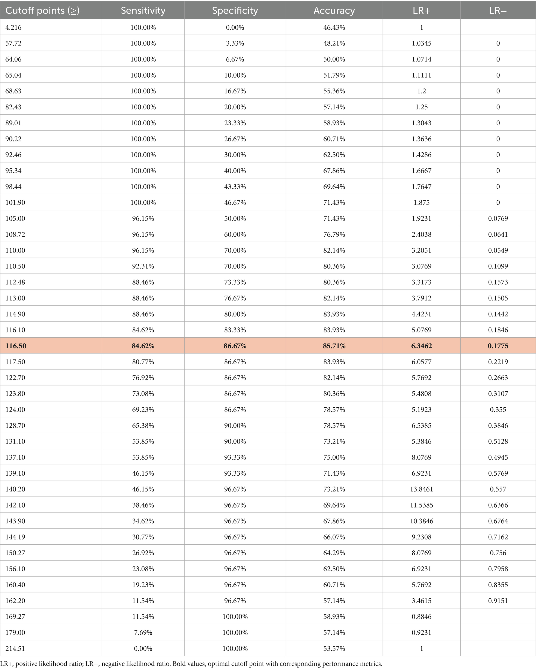 The optimal cutoff point for stratifying subjects into low- and high-risk categories for MCI, based on the model, was determined through sensitivity analysis using the Youden index method (Table 7). At a Youden index of 0.72, the optimal cutoff points of risk score and total points derived from the nomogram were −0.31 and 116.5, respectively. These optimal cutoff points achieved the highest possible accuracy of 85.71%, sensitivity of 84.62%, specificity of 86.67%, PPV of 84.6%, and NPV of 86.6% (Figure 7).