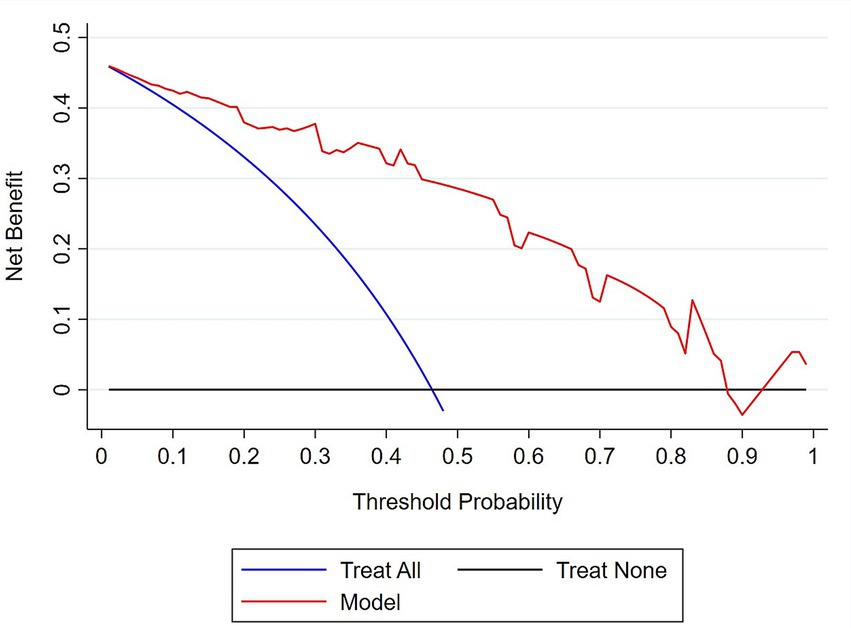 Furthermore, the clinical impact and utility of the model were evaluated by DCA. In the DCA curves, the Y-axis represents the net benefit, while the X-axis indicates the threshold probability.