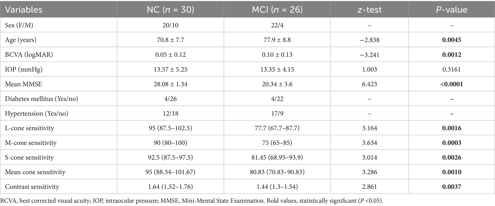 A total of 56 subjects participated: 30 with NC (mean age, 70.8 ± 7.7 years) and 26 with MCI (mean age, 77.9 ± 8.8 years). The mean cognitive score of subjects with MCI, as measured by the MMSE, was 20.34 ± 3.6, which was significantly lower than that of the NC subjects (28.08 ± 1.34, p < 0.0001). A significant proportion of the study subjects (75%) were females. Nearly half of the study subjects (51%) had chronic health conditions such as diabetes mellitus and hypertension. The L-, M-, and S-cone contrast thresholds were significantly reduced in subjects with MCI (p < 0.05). Significantly reduced contrast sensitivity was also observed in subjects with MCI (p = 0.0037). A significant sex-specific difference in cognitive score, contrast sensitivity, and chromatic contrast was not observed (p > 0.05) (Table 1).