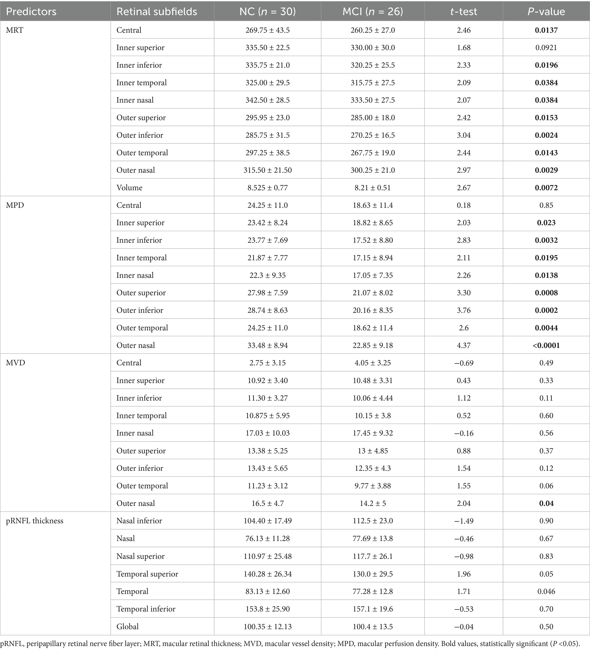 Compared with NC subjects, MCI subjects showed a statistically significant reduction in MRT across all ETDRS retinal subfields, except the inner superior subfield. In contrast, for pRNFL, the temporal thickness was the only subfield that exhibited a significant decrease in subjects with MCI compared to the NC subjects (NC: 83.13 ± 12.69; MCI: 77.28 ± 12.77, t = 1.71, p = 0.046) (Table 2). Significant central retinal thickness within 3 mm diameter was noted in females compared to male participants (p < 0.05).