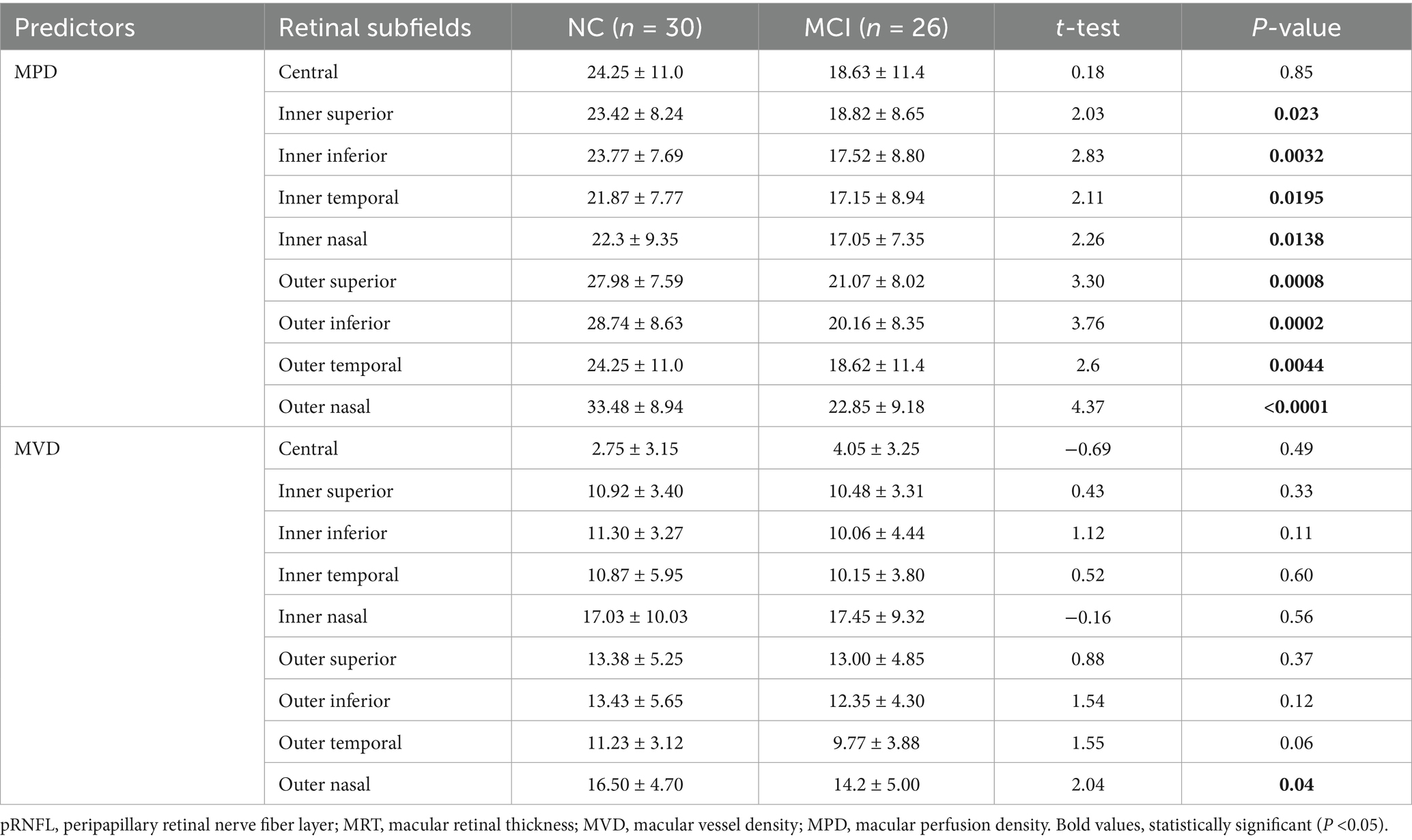 Table 3. Comparison of retinal vascular features of the superficial vascular layer between subjects with MCI and NC.