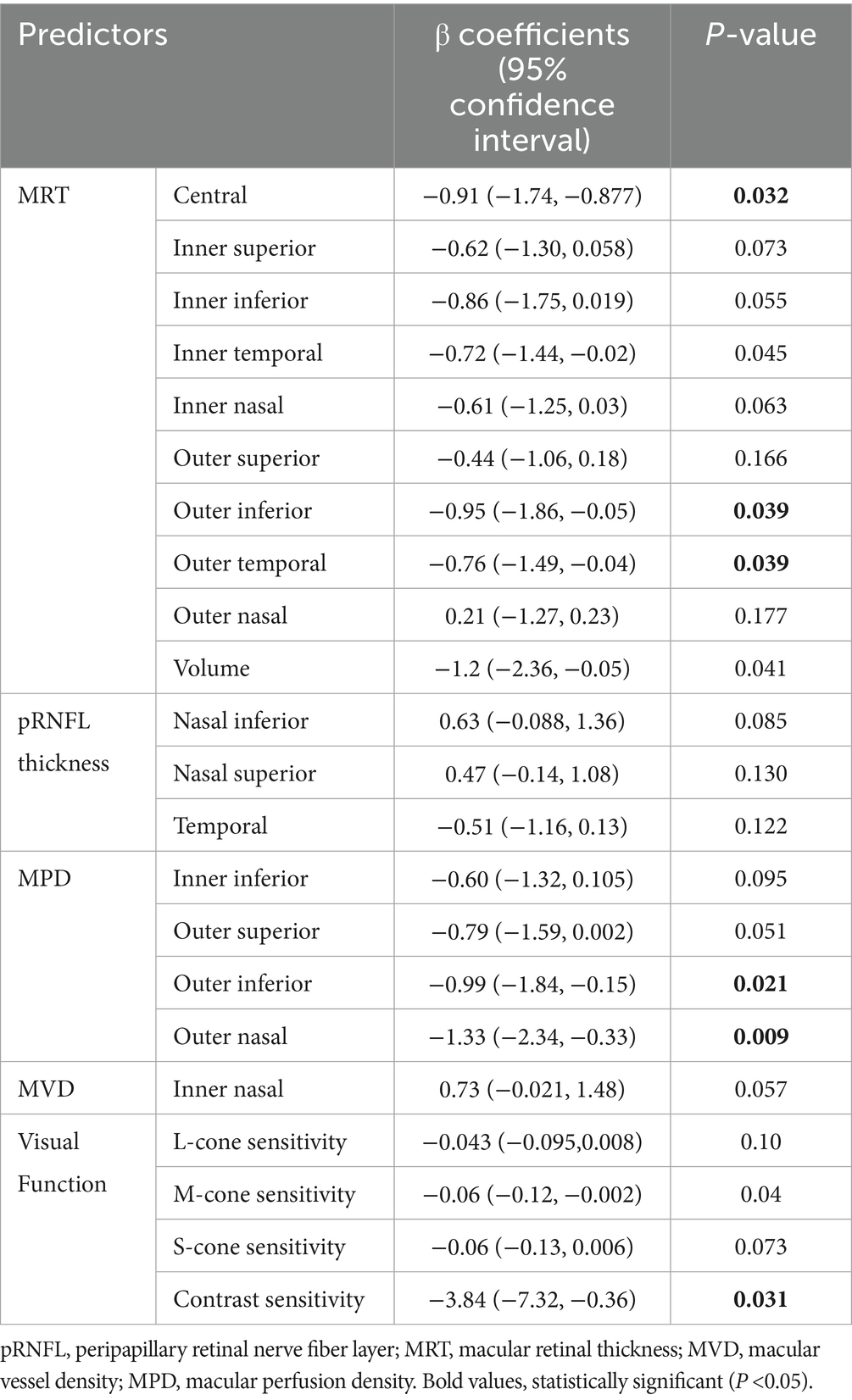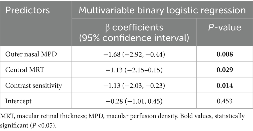 Following screening for multicollinearity, 16 potential variables were examined using univariate analysis after adjusting for age (Table 4). These predictors were entered into the LASSO regression algorithm using a 10-fold cross-validation approach. Systematically, less relevant variables were shrunken to zero as the penalty coefficient (λ) increased. At the 0.056 optimal lambda value selected by cross-validation, 9 predictors, including age, contrast sensitivity, M-cone contrast, central MRT, outer temporal MRT, nasal inferior pRNFL, nasal superior pRNFL, outer nasal MPD, and outer superior MPD, were selected. In contrast, the coefficients of 7 predictors were shrunken to zero (Figure 2).