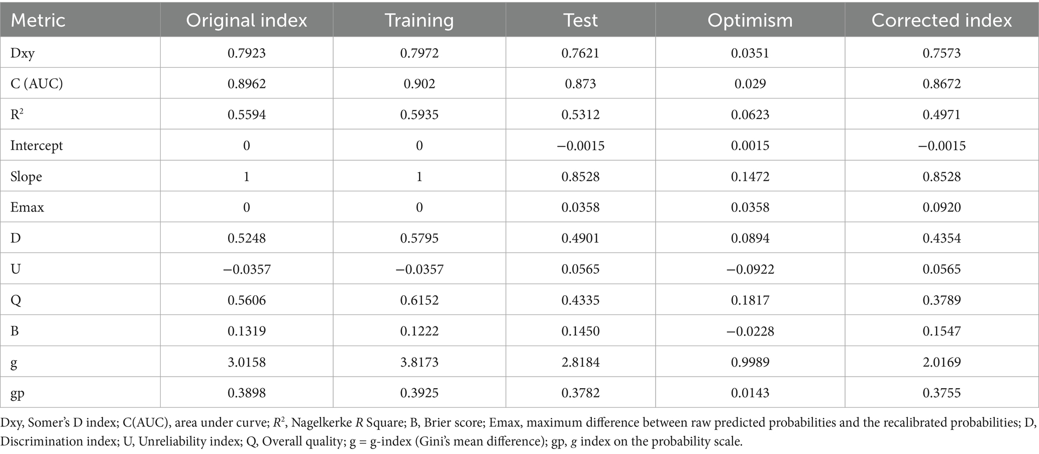 The overall model evaluation demonstrated reasonably high performance, with a Nagelkerke R-squared of 0.40. Spiegelhalter’s z-statistic p-value of the final model was 0.58, indicating that the observed and predicted probabilities were well matched and calibrated. The Brier score was 0.13, indicating high predictive accuracy. The optimism coefficients for the intercept, Brier score, and R2 were −0.0228, 0.06, and −0.0015, respectively, indicating the closeness of the bias-corrected value to the original index and ensuring high performance after validation (Table 6).