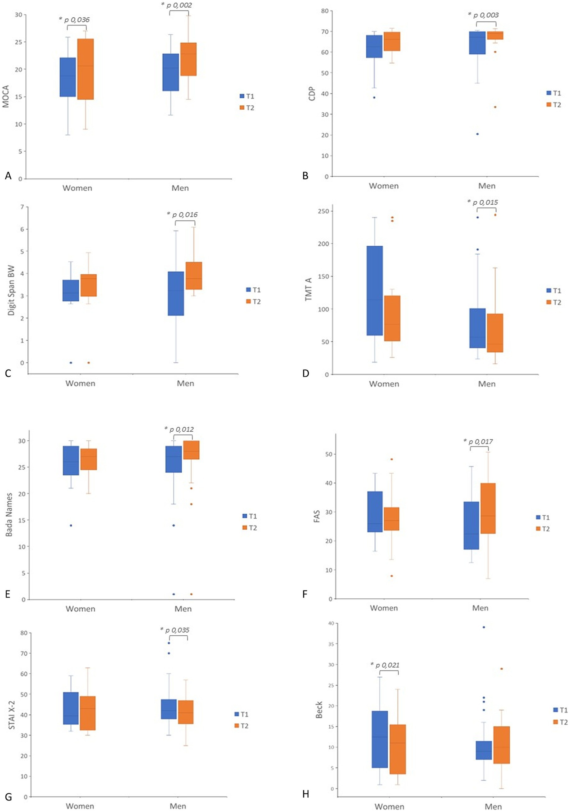 Figure 1. Box plot of pre- to post-treatment scores (T1–T2) in men and women. Separate panels show scores for each outcome measure. (A) MoCA; (B) CDP; (C) Digit Span BW; (D) TMT-A; (E) BADA Names; (F) FAS; (G) STAI X-2; (H) Beck. Statistical significance was considered for p < 0.05. MOCA, Montreal Cognitive Assessment; CDP, Copy Drawing Performance; BW, Digit Span Backward; TMTA, Trail Making Test Part A; T BADA, Battery for the Analysis of Aphasic Deficits; FAS, Phonemic Verbal Fluency; Beck; STAIX2, Trait Anxiety Inventory.