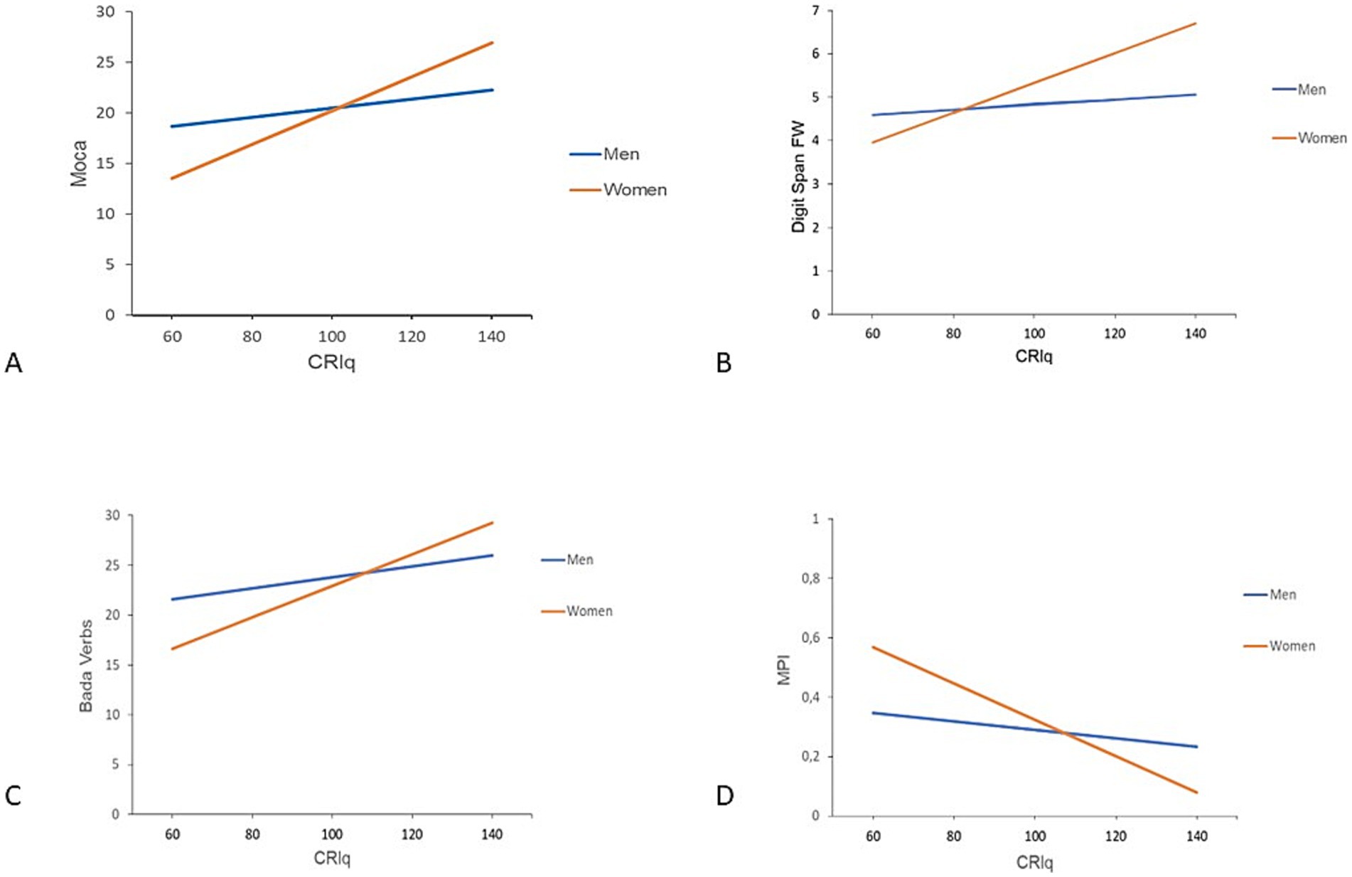 Figure 2. Interaction effect between CRIq and gender on cognitive outcomes. The plot shows the regression lines for men (blue) and women (orange), illustrating the interaction between CRIq and gender on cognitive outcomes. (A) MoCA; (B) Digit Span—FW; (C) BADA Verbs; (D) MPI. MOCA, Montreal Cognitive Assessment; FW, Digit Span Forward; BADA, Battery for the Analysis of Aphasic Deficits; MPI, Multidimensional Prognostic Index.