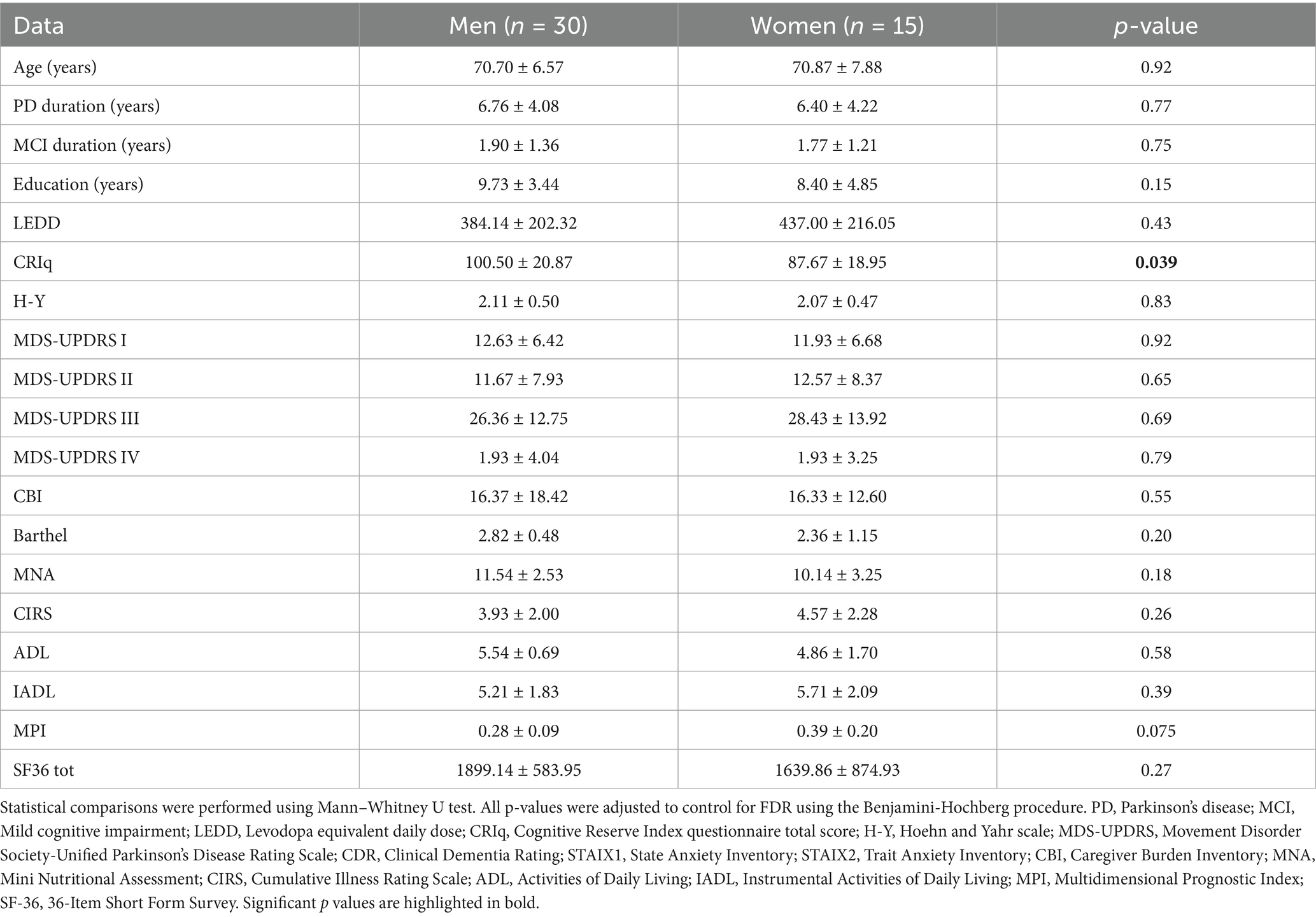 In our study, women also showed a higher frailty index in comparison to men, using the MPI assessment. This result is consistent with previous researches indicating a greater prevalence of frailty among older women, even without PD. Indeed, several studies have demonstrated that women tend to accumulate more health deficits with age, leading to higher frailty scores compared to men (Roland et al., 2012; Gordon et al., 2017).