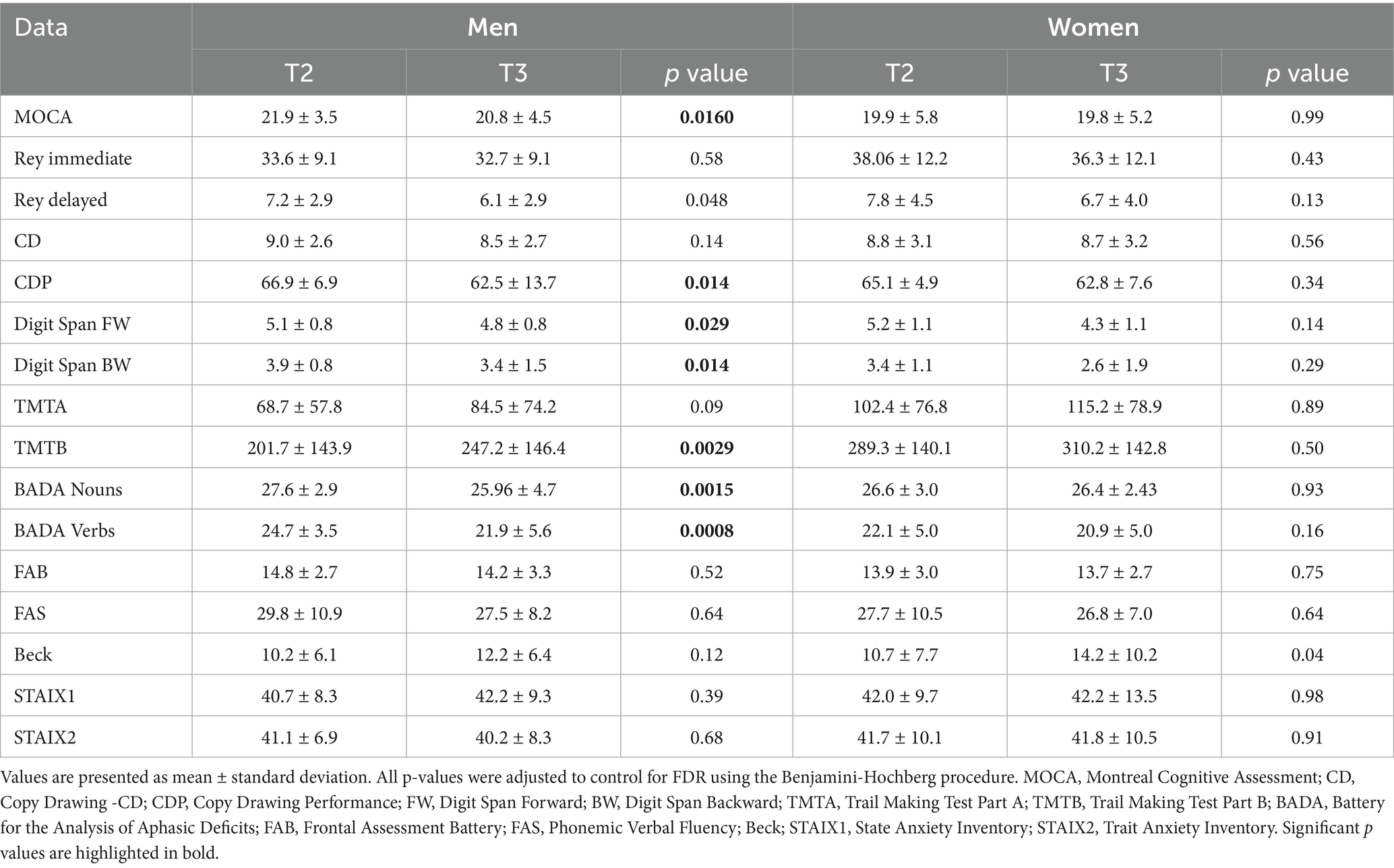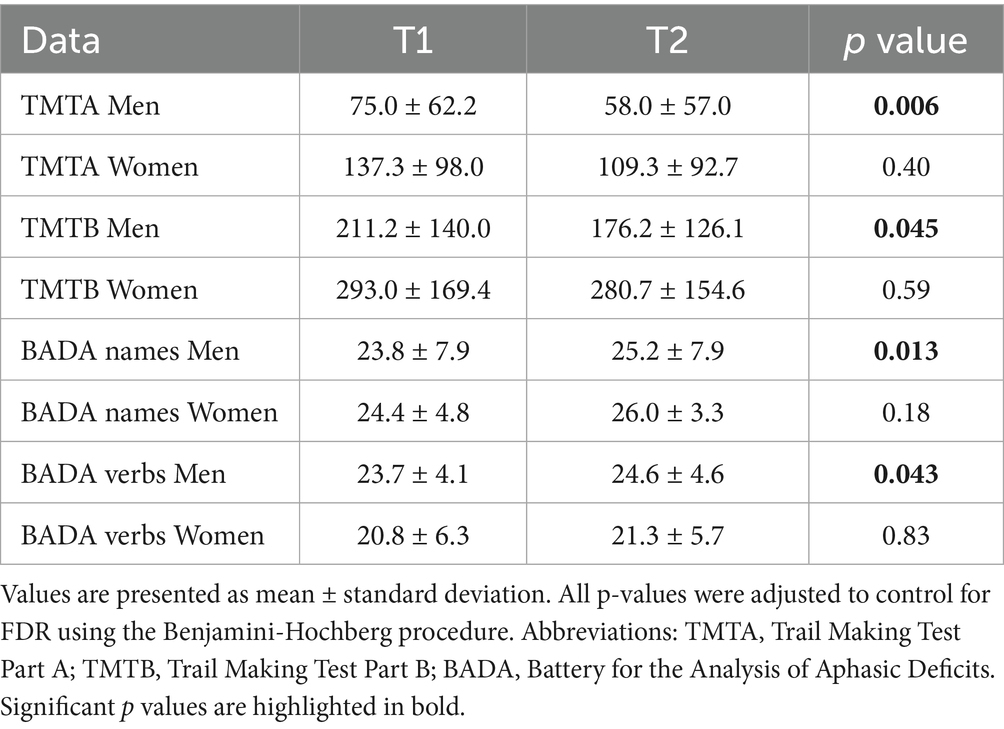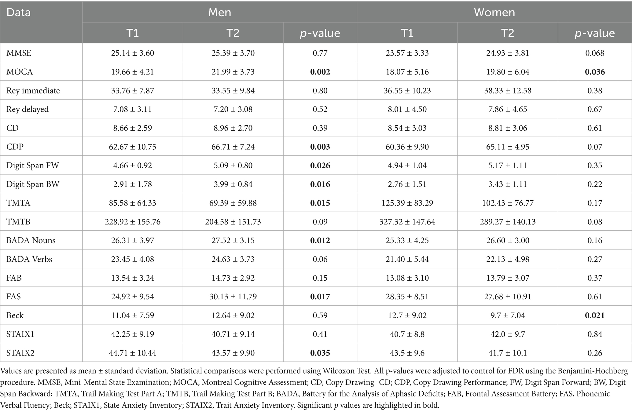 All statistical analyses were performed using R (version 2025.05.0 + 496). Descriptive statistics were used to summarize clinical and demographic characteristics. Continuous variables expressed as means and standard deviations (SD). Baseline (T1) comparisons between men and women were performed using independent-samples t-tests for normal distribution or the Mann–Whitney U test for non-normal distribution, depending on the results of the Shapiro–Wilk normality test. The Wilcoxon test was used for comparisons between measurements over time. We also conducted a Multivariate Analysis of Covariance (MANCOVA), including any significant variable at baseline as a covariate. Separate multiple linear regression models were used to explore if the treatment effect and the influence of significant variables at baseline on cognitive outcomes were modulated by gender. To account for multiple comparisons, all p-values were adjusted for a false discovery rate (FDR) of 0.05 using the Benjamini Hochberg method.