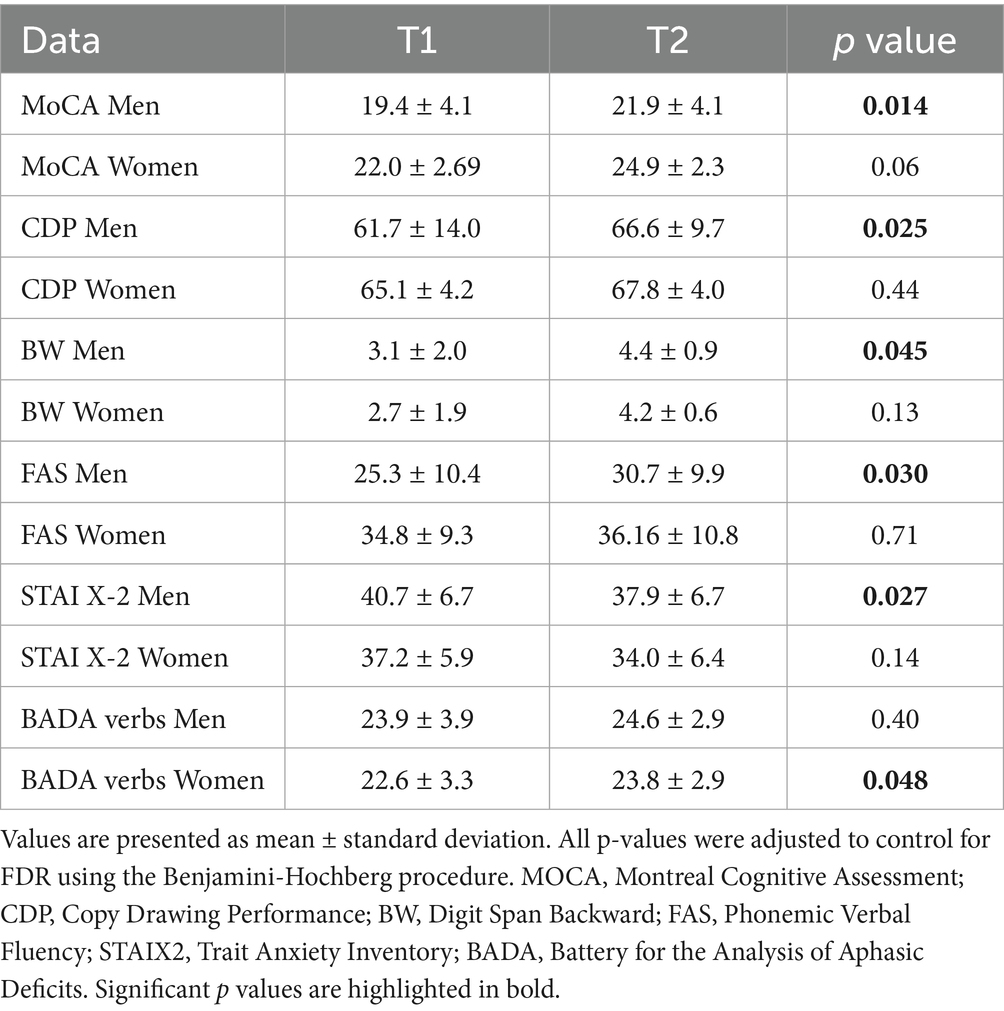 In the control group, after cognitive stimulation, men outperformed women in several areas. They exhibited higher scores on the MoCA (p = 0.014), better visuospatial abilities as measured by the Copy of Drawing Test (p = 0.025), improved working memory on the Digit Span BW test (p = 0.045), greater verbal fluency in the FAS task (p = 0.030), and lower anxiety levels according to the STAI-X2 (p = 0.027). Among women in the CG, a significant improvement was observed only in the BADA Naming Task for verbs (p = 0.048) (Tables 3–4).