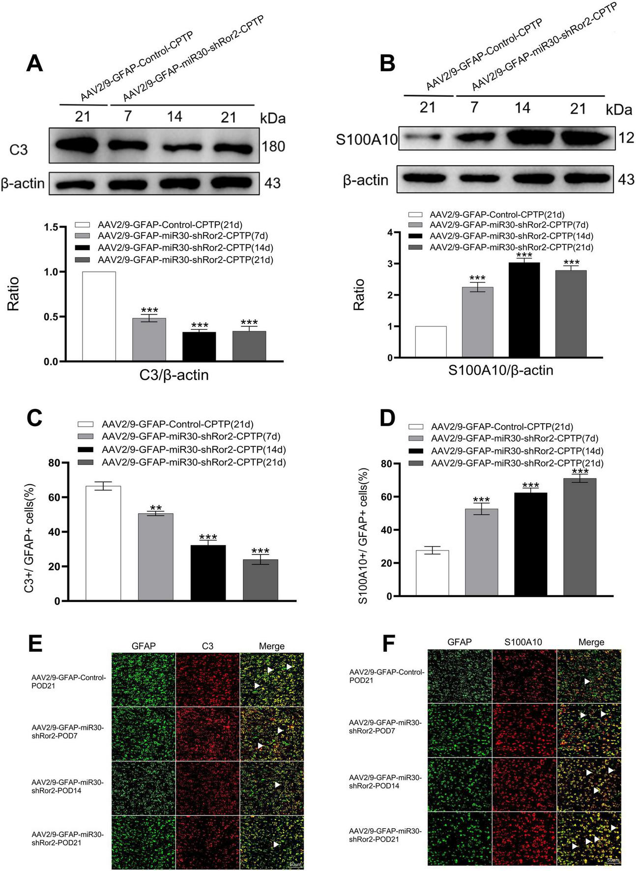 In contrast to the AAV2/9-GFAP-Control-non-CPTP group, the AAV2/9-GFAP-miR30-shRor2-non-CPTP group showed a marked increase in scratching behavior from POD 1 to 5 (Figure 4D). Conversely, the AAV2/9-GFAP-miR30-shRor2-CPTP group demonstrated a substantial and sustained reduction in scratching from POD 7 to 21, compared with that in the AAV2/9-GFAP-Control-CPTP group (Figures 4D, F). The findings revealed that AAV2/9-GFAP-miR30-shRor2 treatment resulted in elevated MWT levels and a notable decrease in cold acetone-induced scratching in CPTP rats across POD 7 to 21, suggesting that suppressing astrocytic Ror2 in the ACC effectively mitigates pain behaviors associated with CPTP.