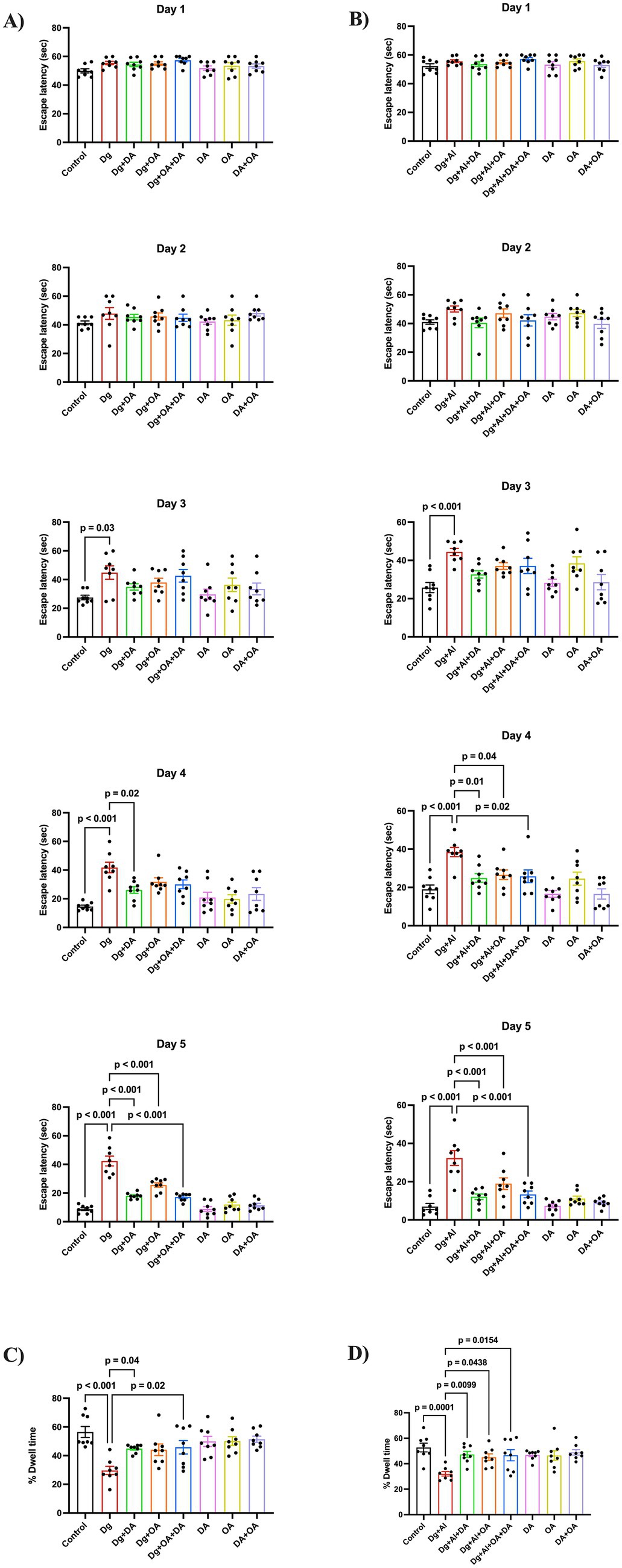 Figure 1. Memory and spatial learning based on the Morris water maze task: The figure shows (A,B) escape latencies to find the hidden platform during the training phase from Day 1 to Day 5, and (C,D) % of dwell time spent in the target quadrant during the probe trial, in the D-gal induced aging model and in the D-gal/AlCl3 induced AD-like neurotoxic model, respectively. Data is represented as Mean ± SEM (n = 8; 4 males, 4 females) and analysed by one-way ANOVA followed by Tukey’s multiple comparison test. Actual p-values for all comparisons are displayed. DA, decanoic acid; OA, octanoic acid; Dg, D-galactose, Al, aluminium chloride (AlCl3).